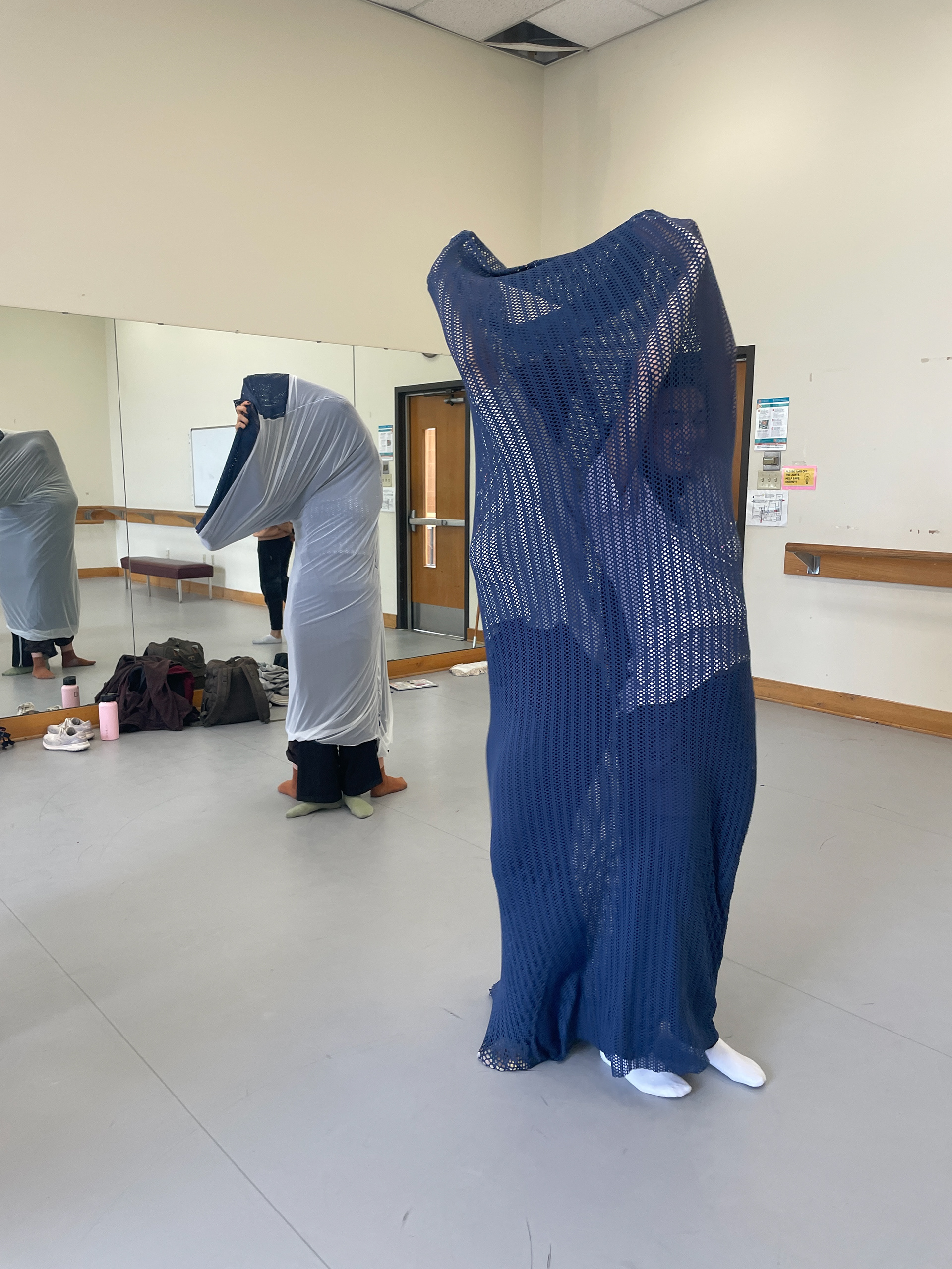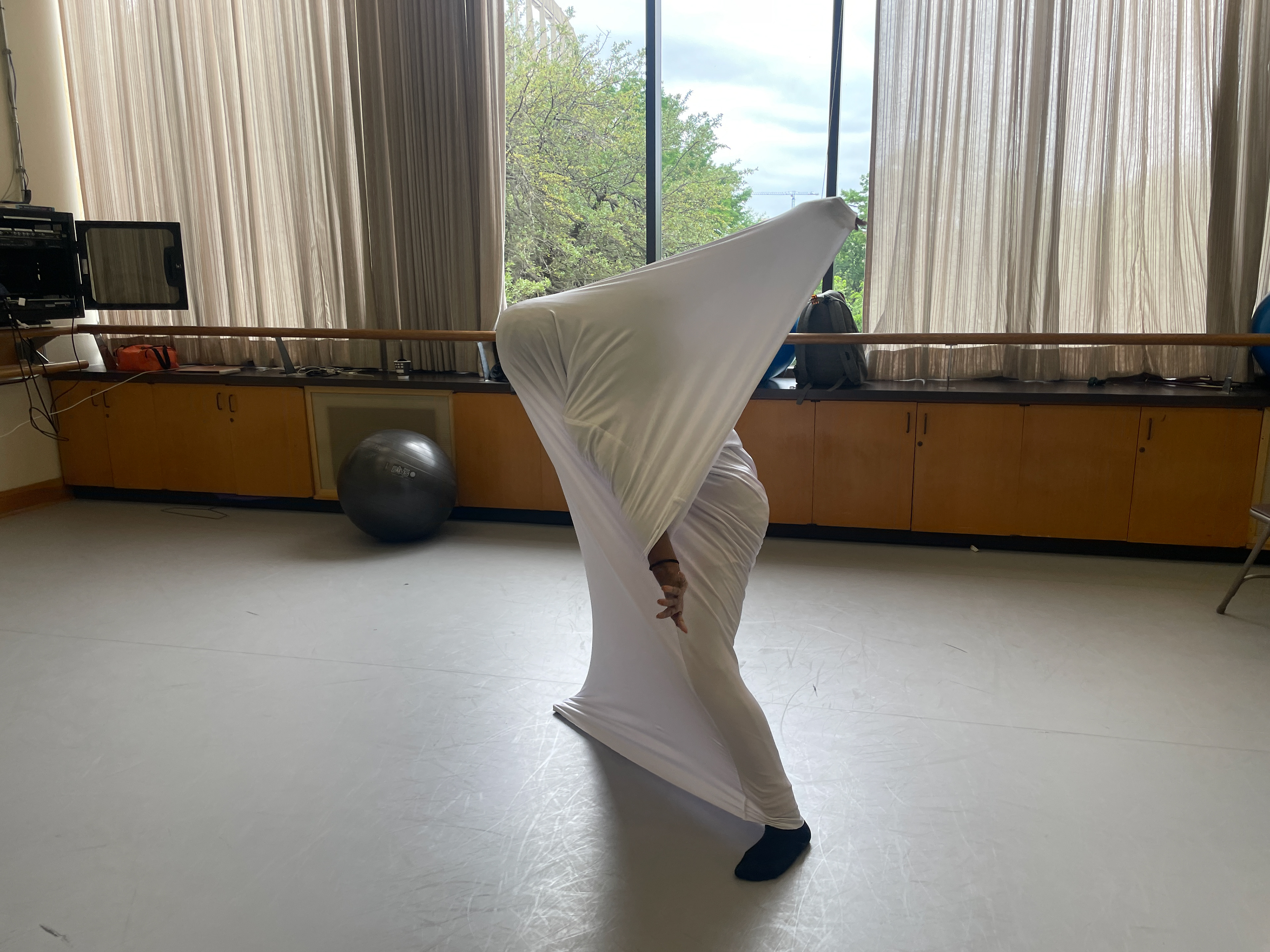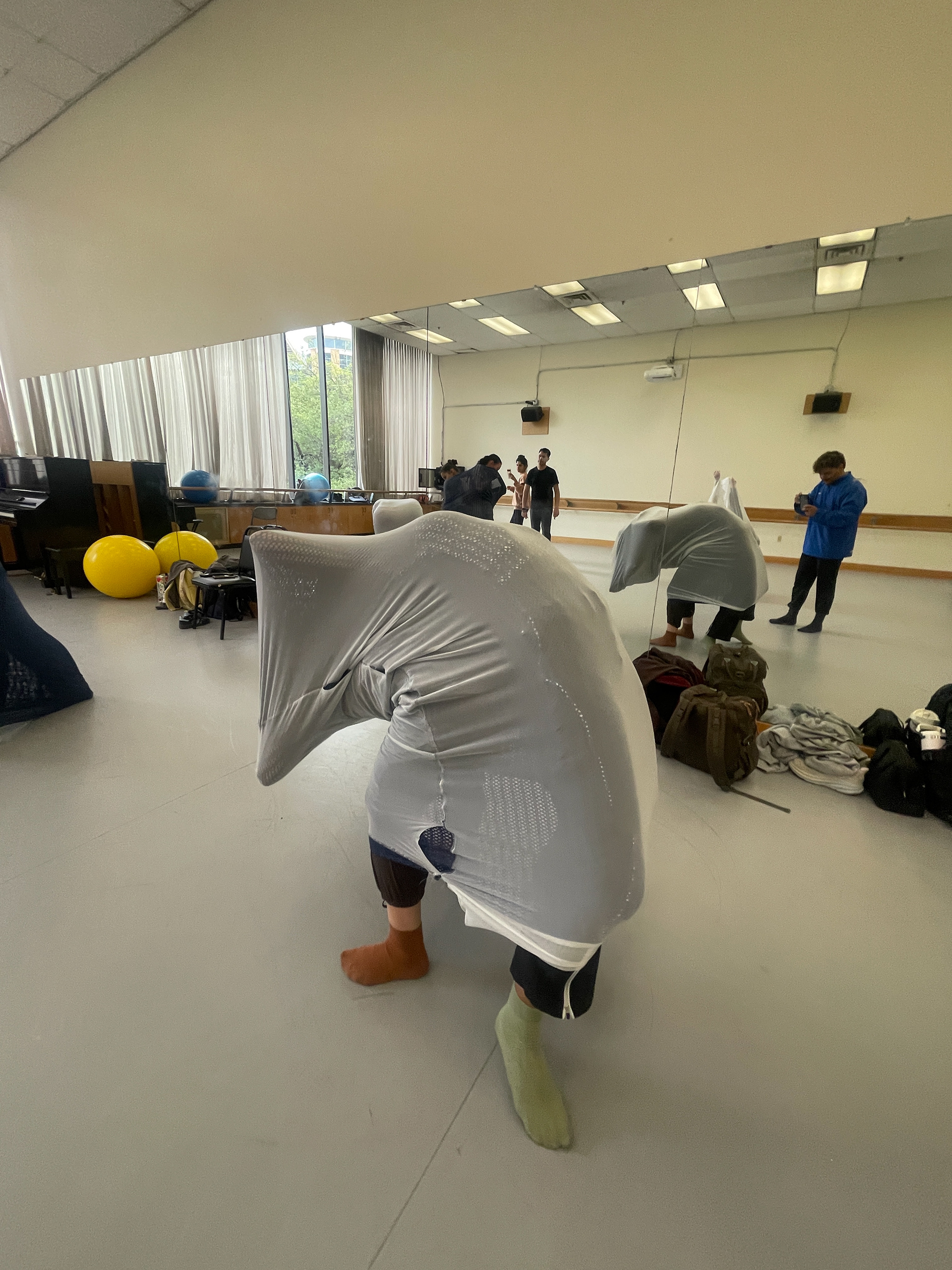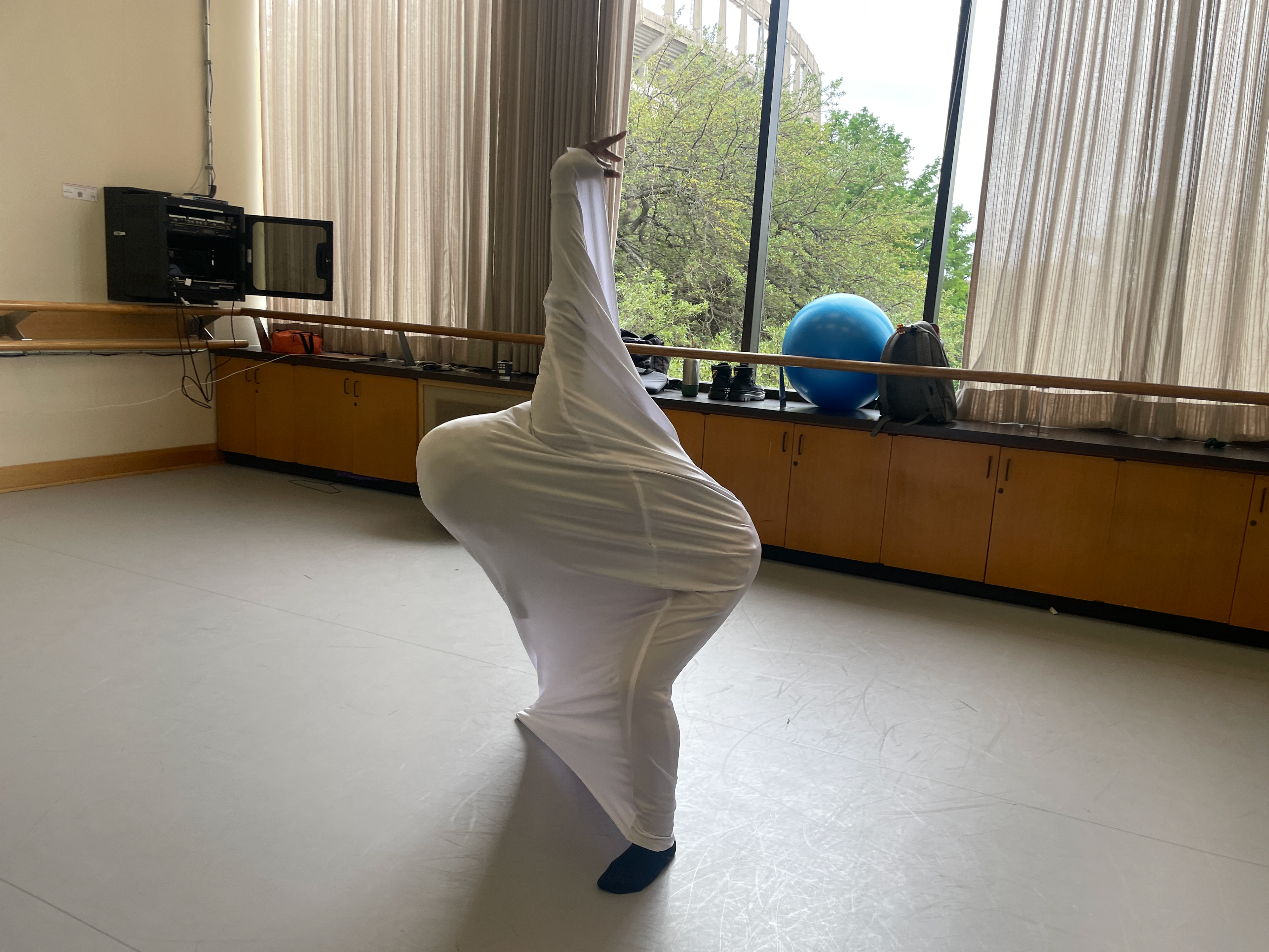 In a movement composition class, I created five spandex cylinders and a long-sleeve shirt piece sewn together at the wrists for dancers to explore. The shifting forms their bodies created were ephemeral and abstract—impossible to replicate with rigid materials.