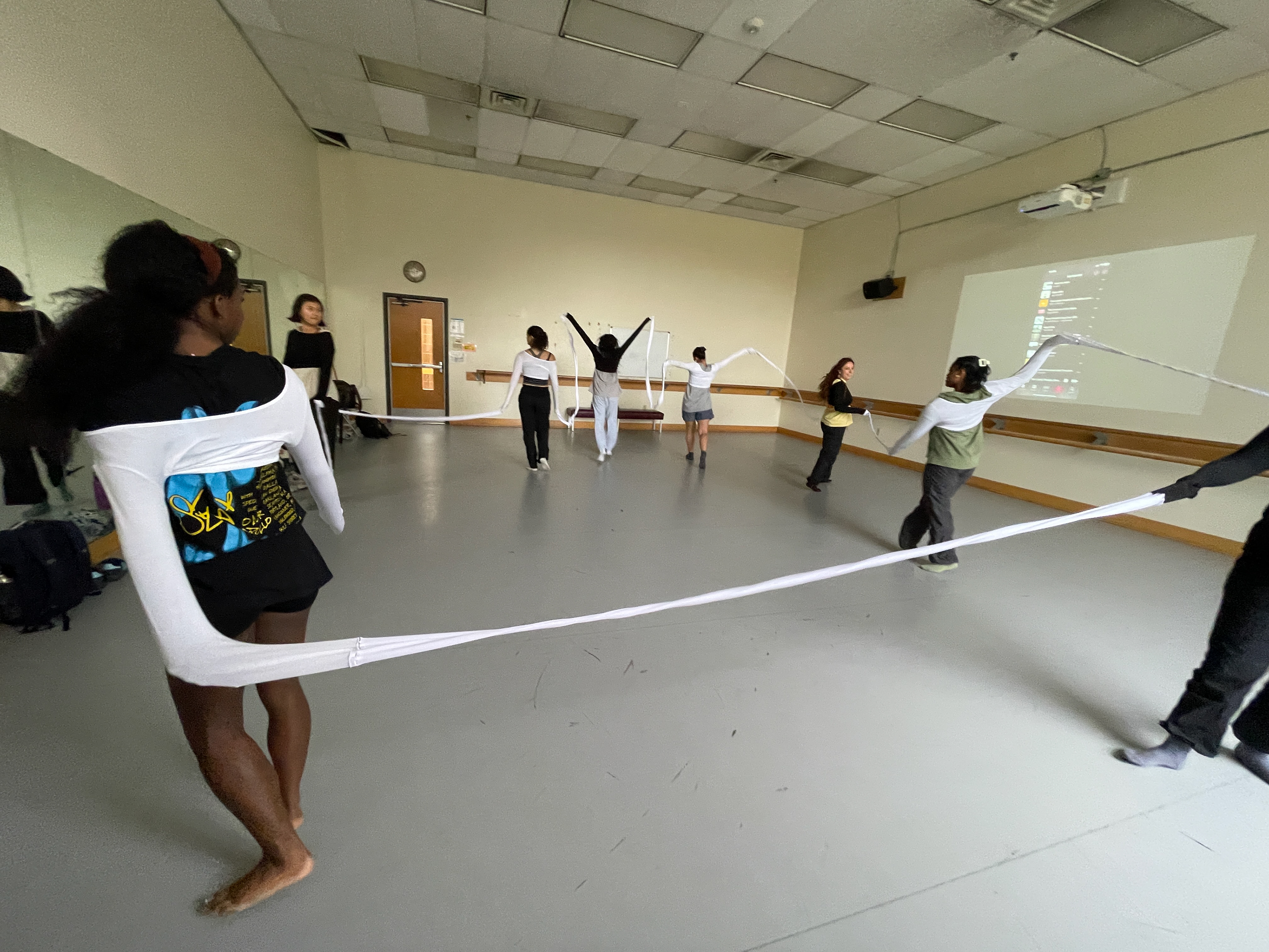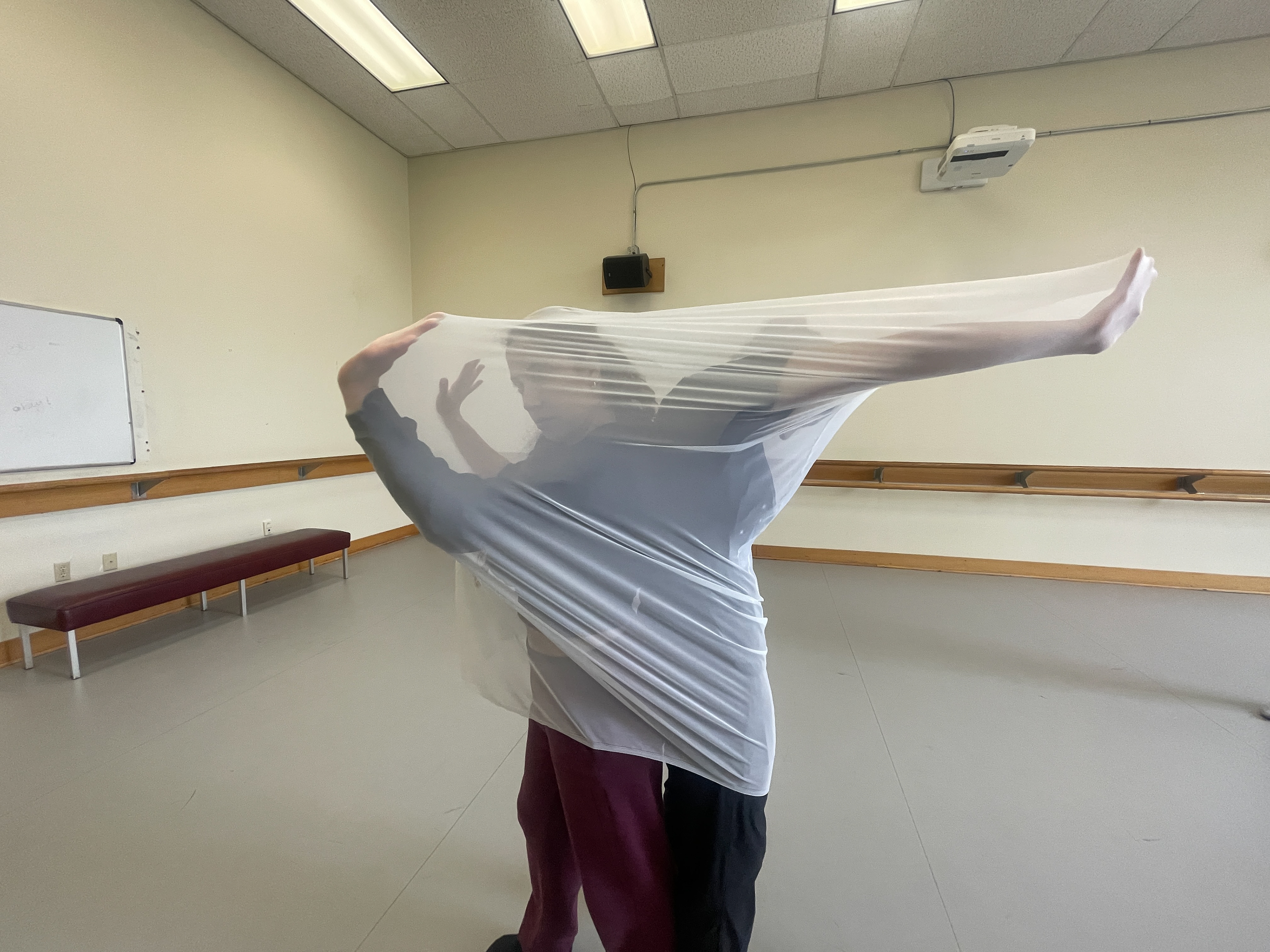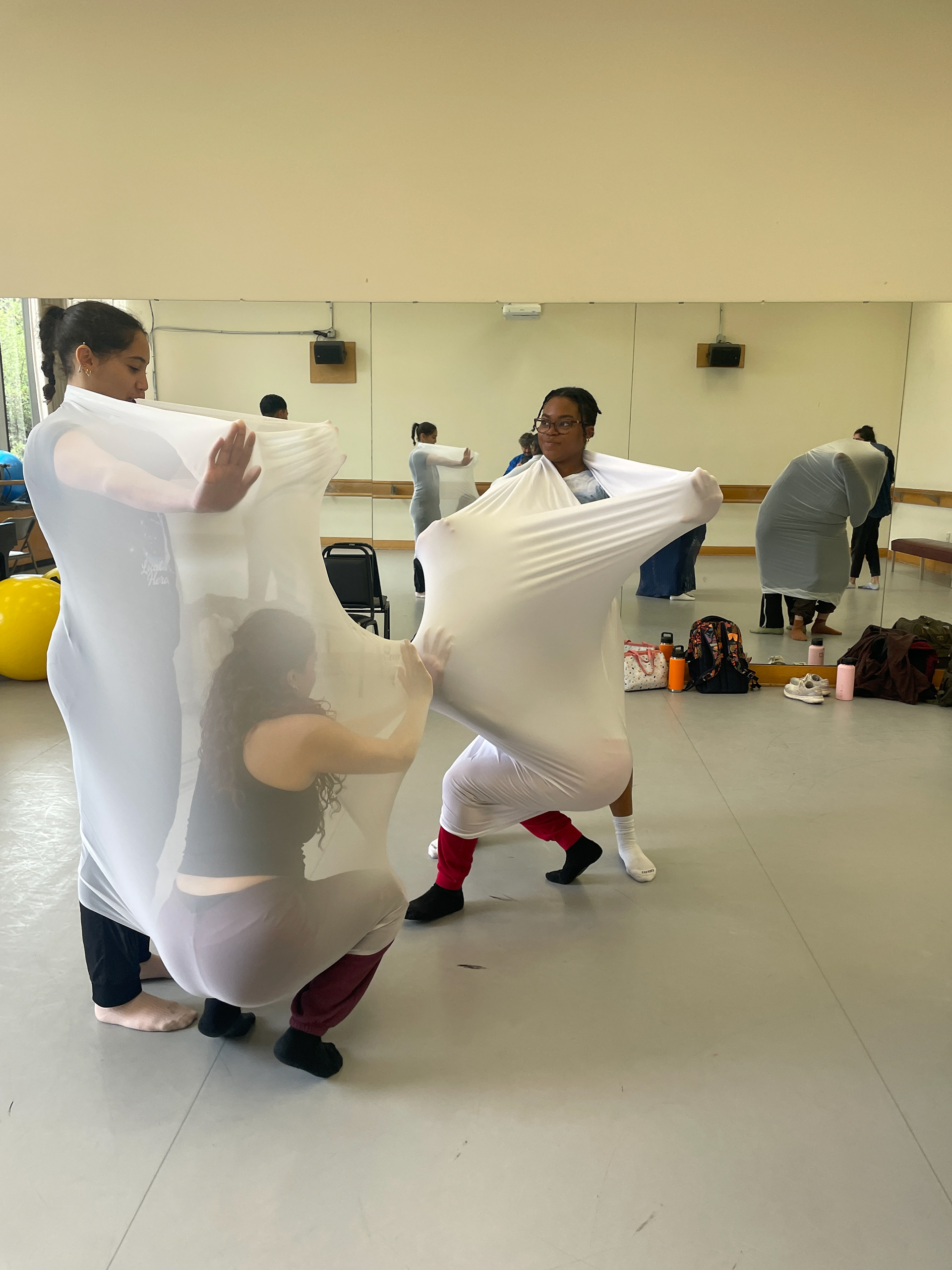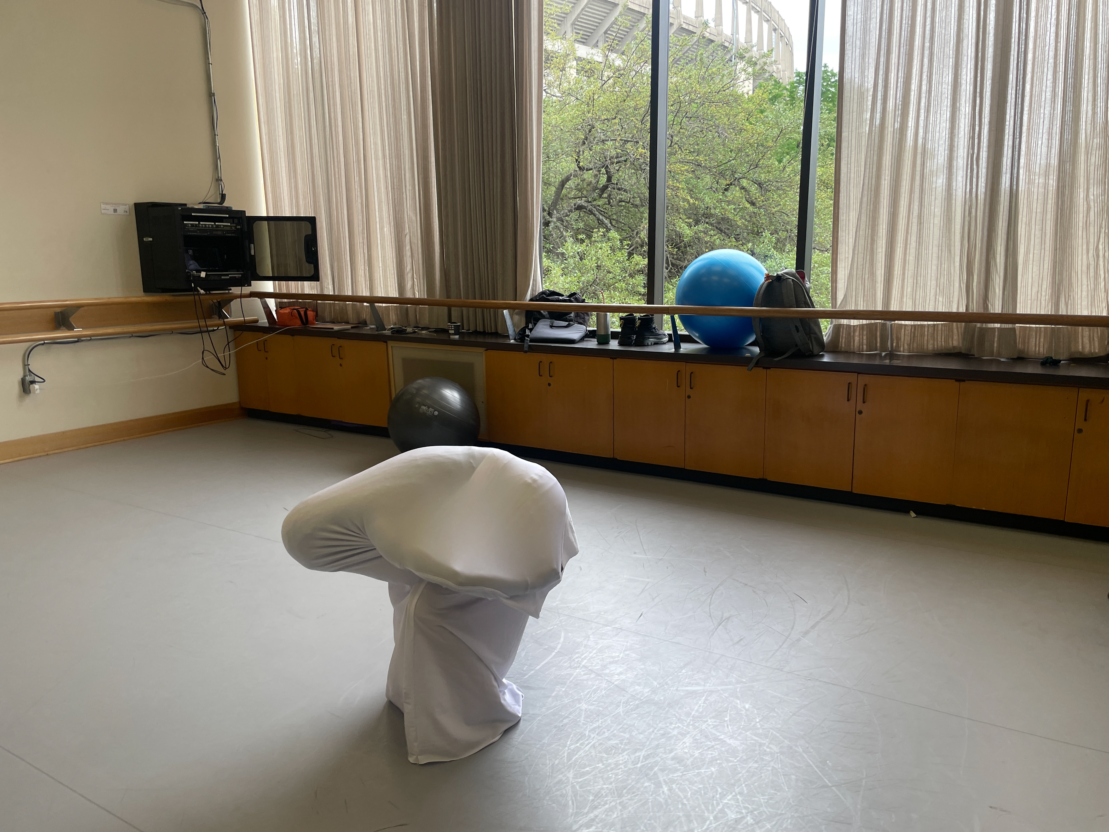 In a movement composition class, I created five spandex cylinders and a long-sleeve shirt piece sewn together at the wrists for dancers to explore. The shifting forms their bodies created were ephemeral and abstract—impossible to replicate with rigid materials.