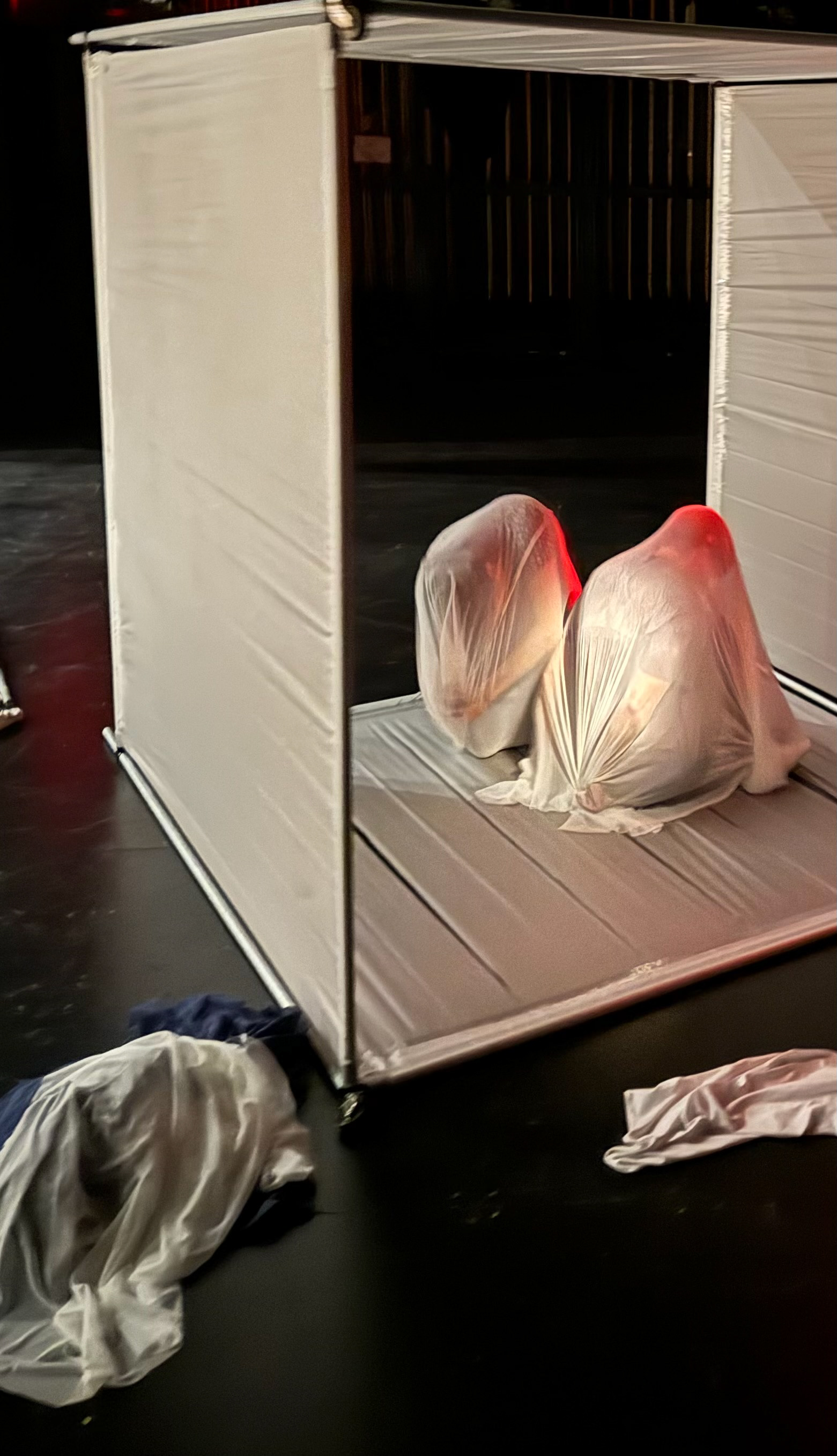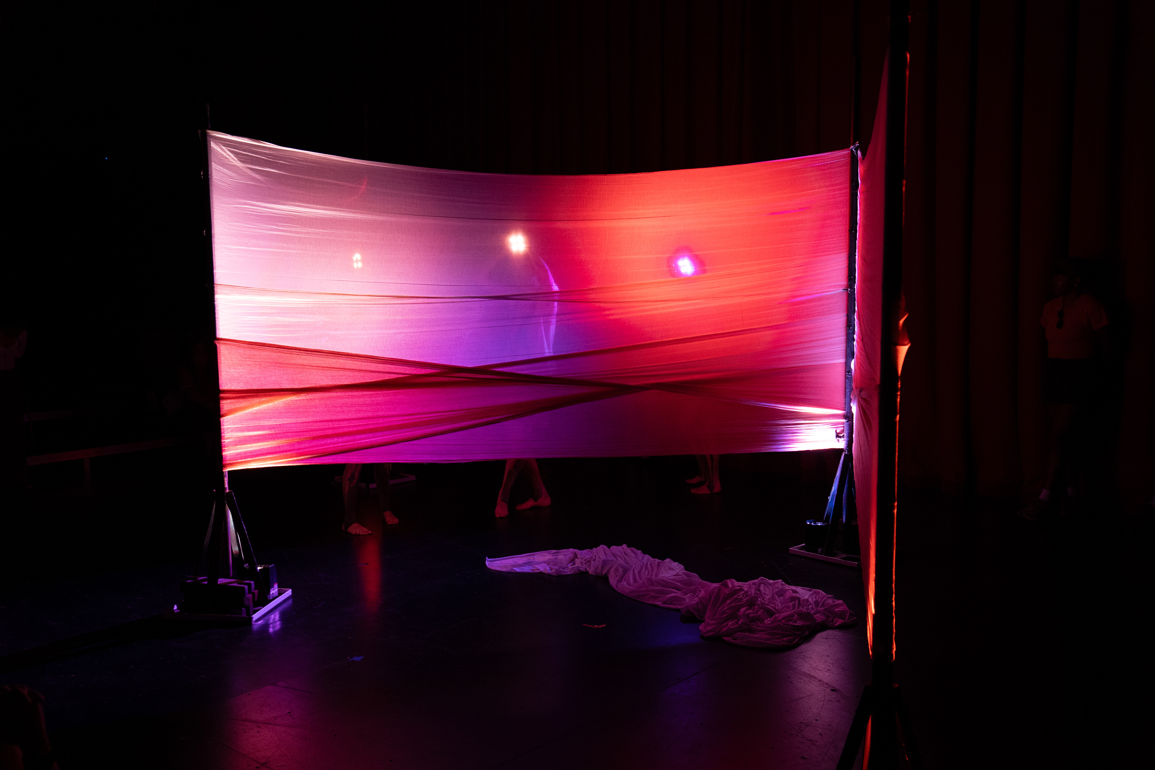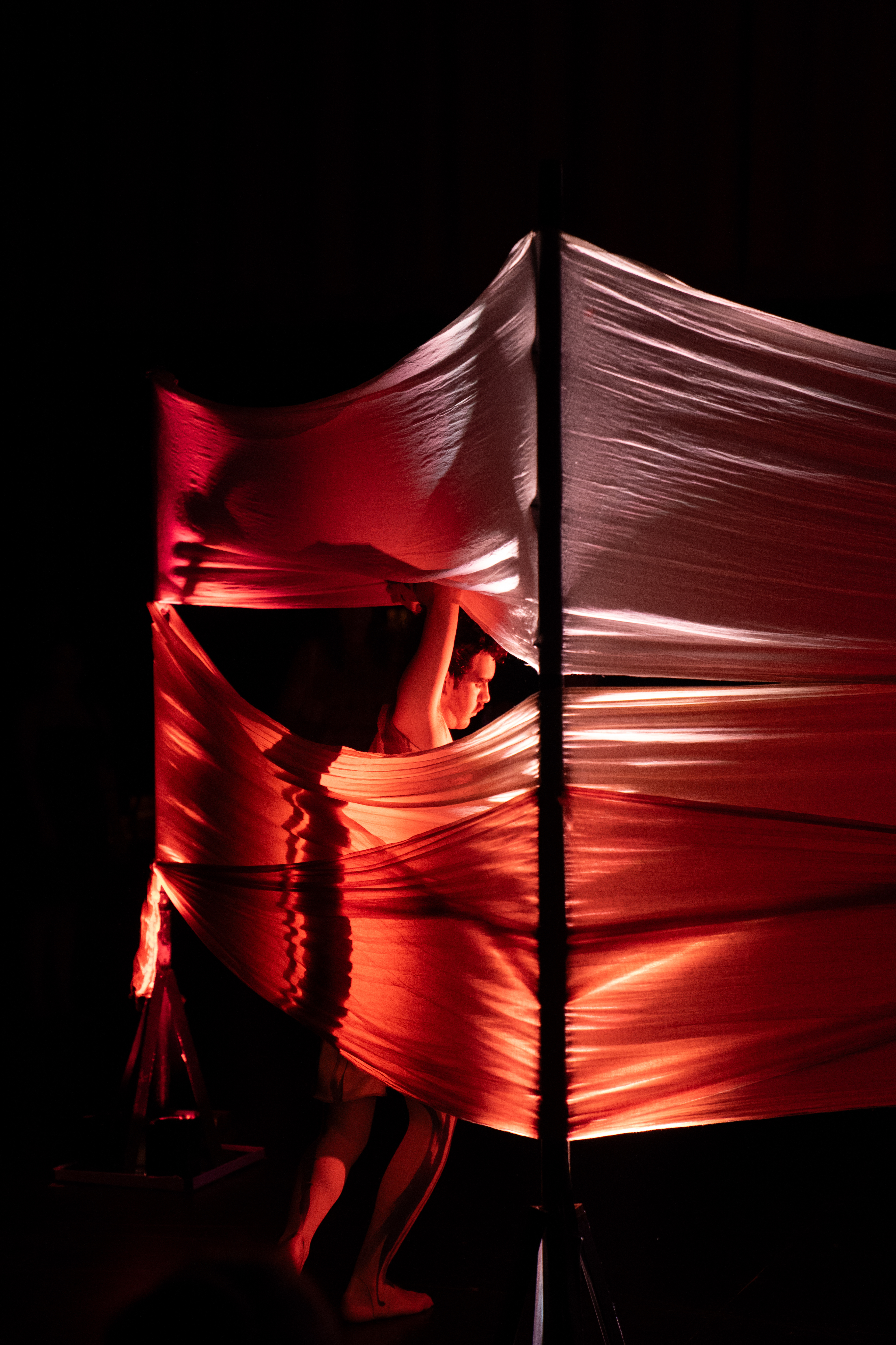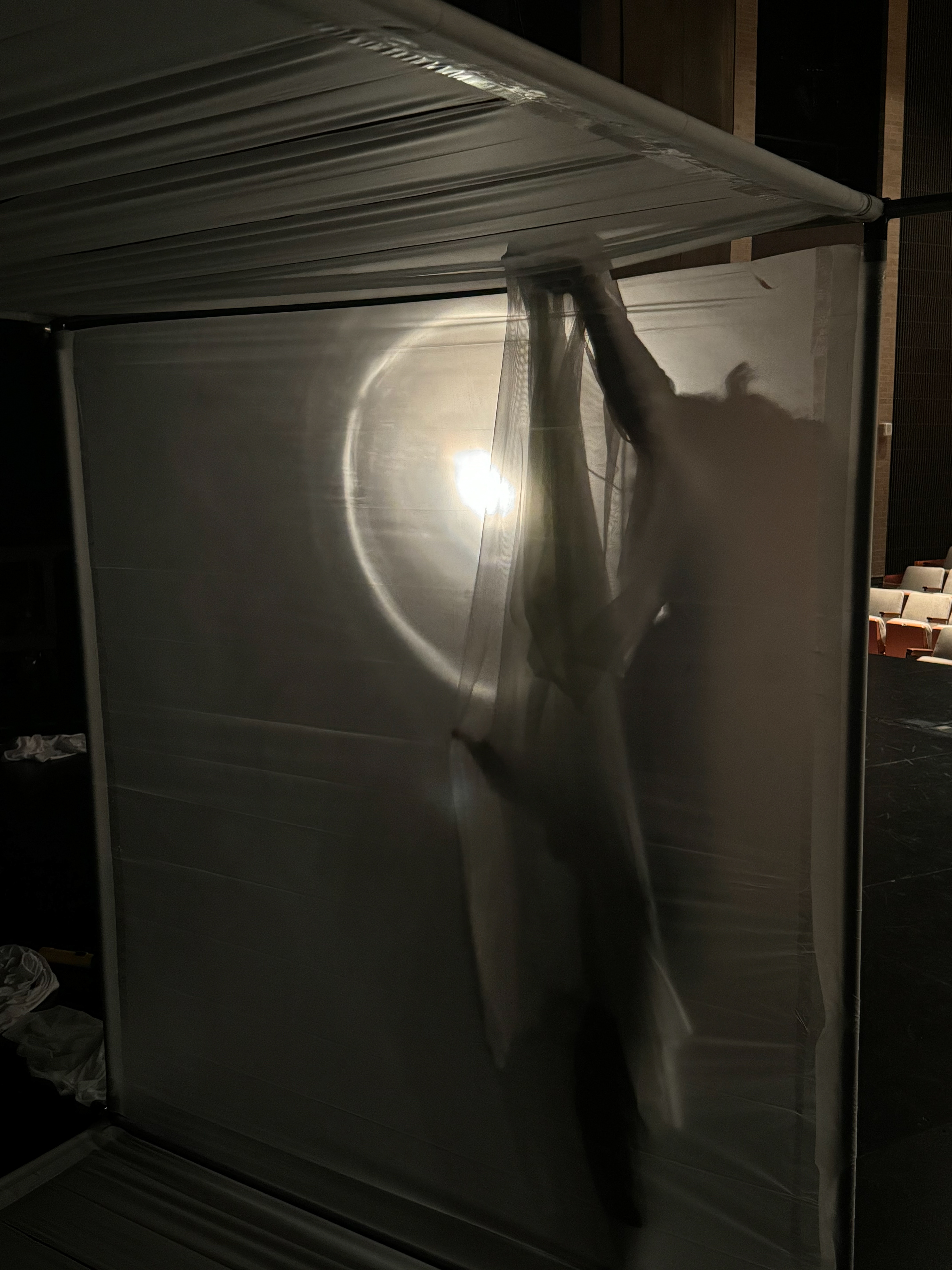 Our final iteration merged all previous explorations. Using soft materials, strong frames, and hanging silks, the structure transformed only when activated by the performer. In that interaction, the scenography truly came alive.