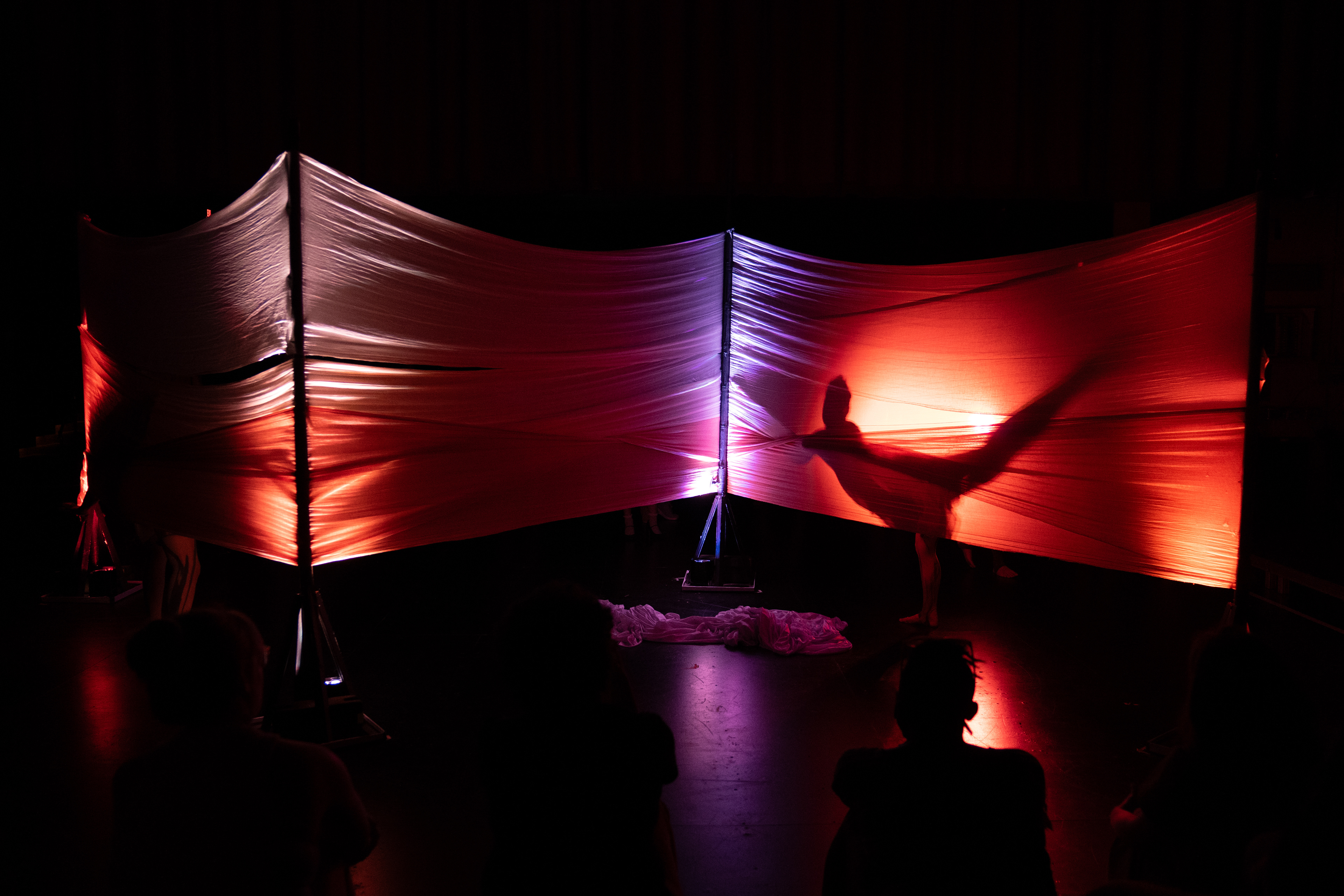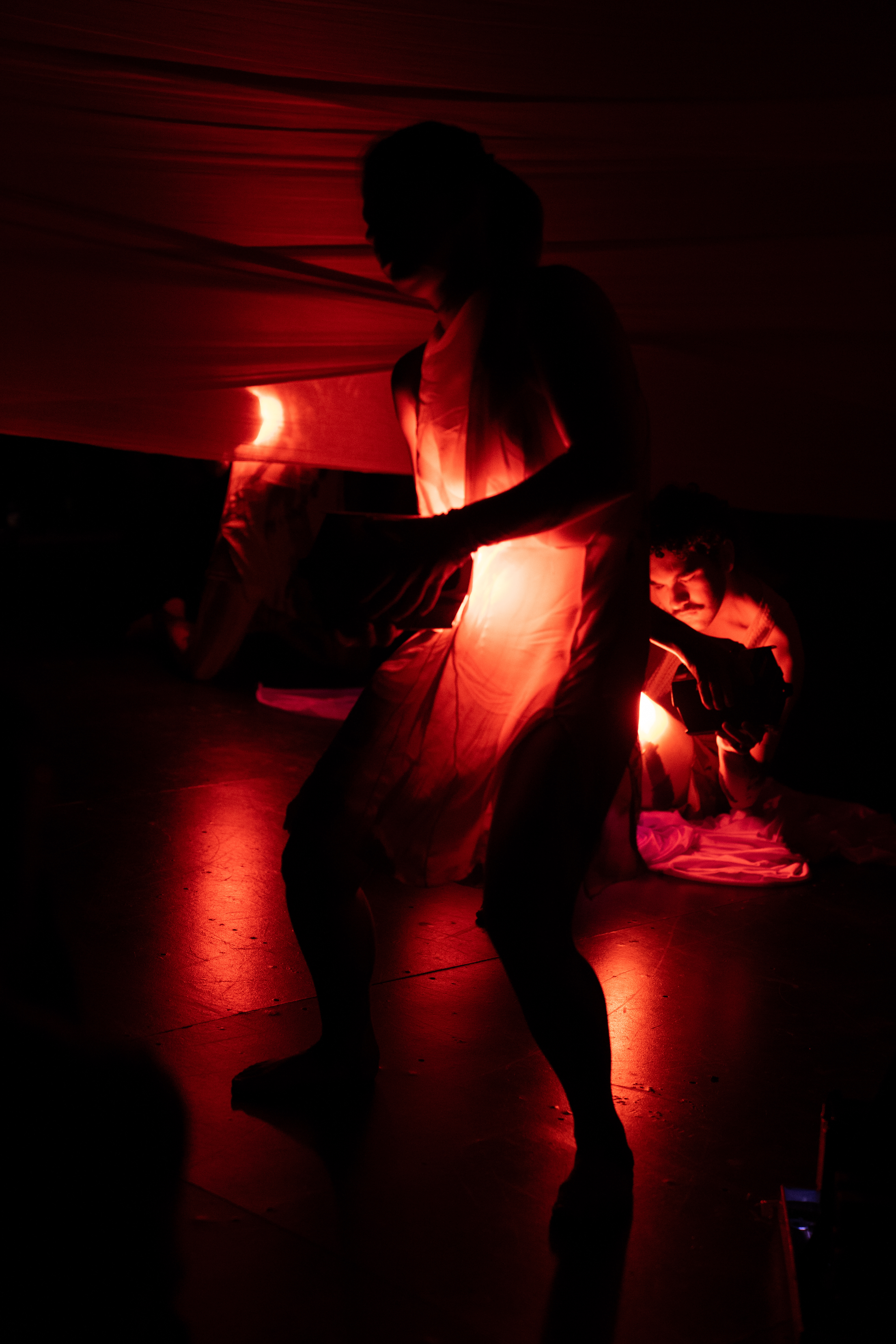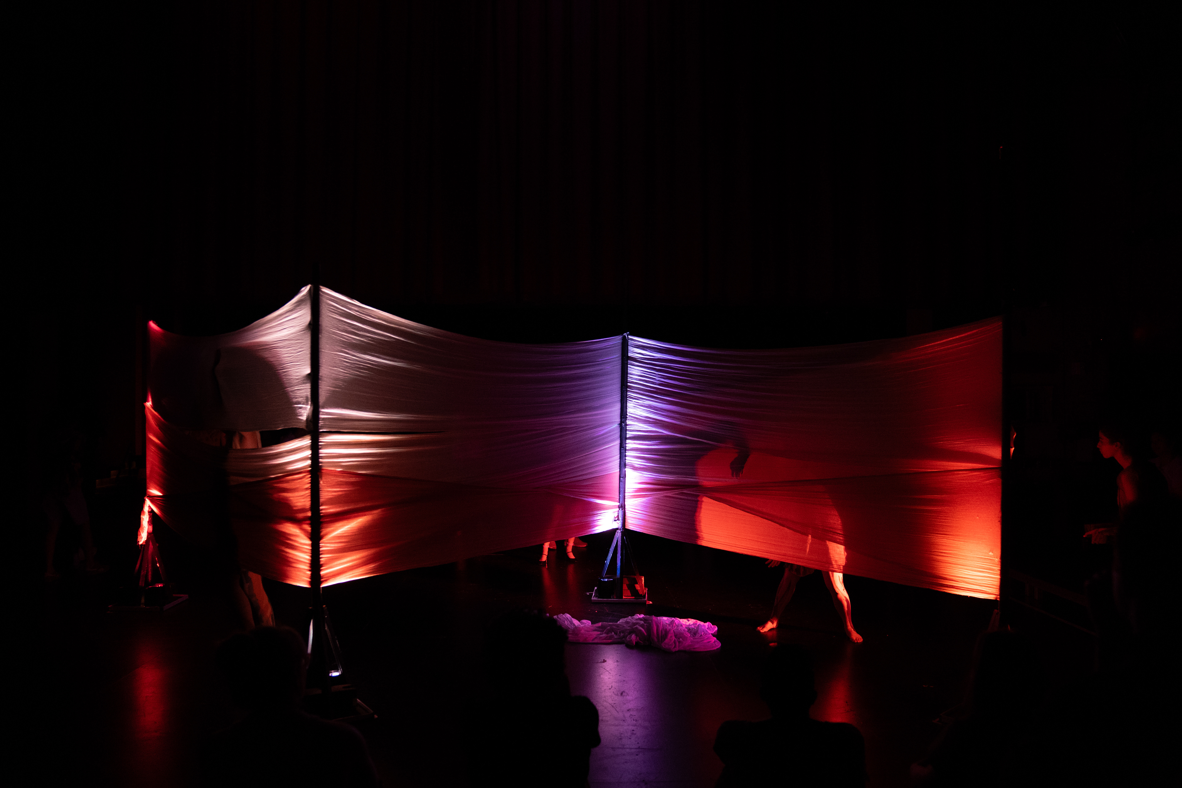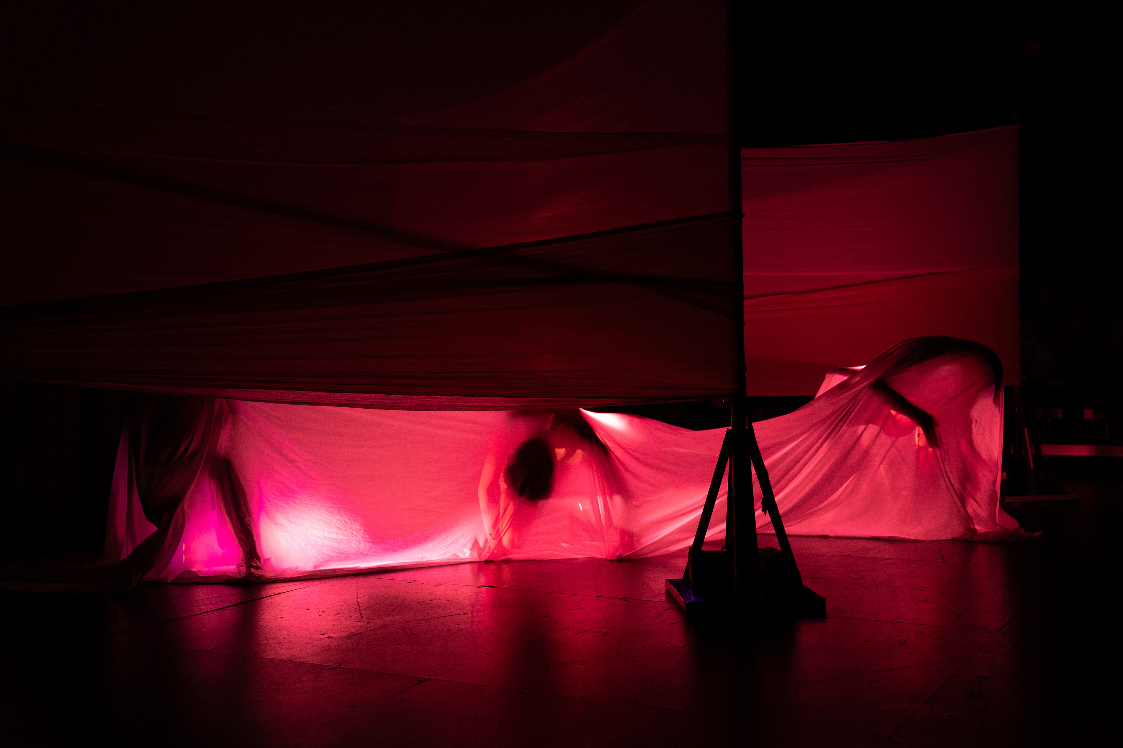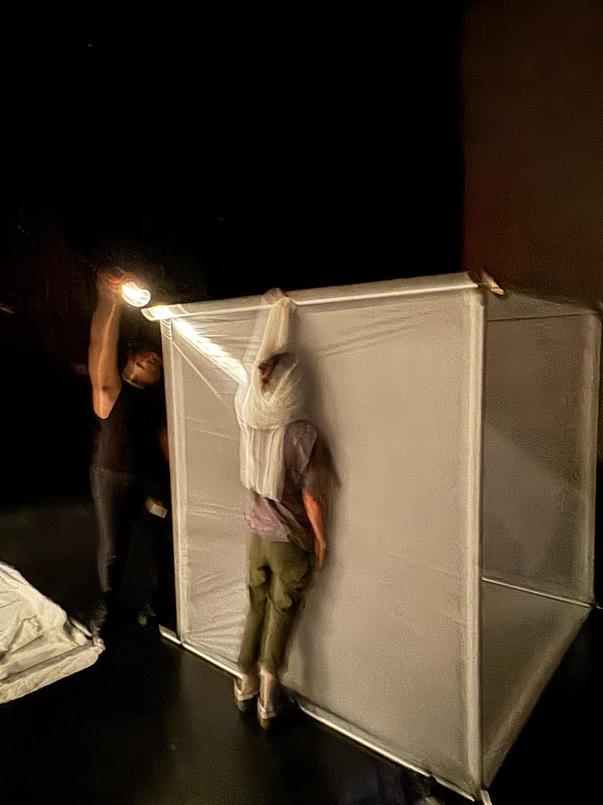 Our final iteration merged all previous explorations. Using soft materials, strong frames, and hanging silks, the structure transformed only when activated by the performer. In that interaction, the scenography truly came alive.