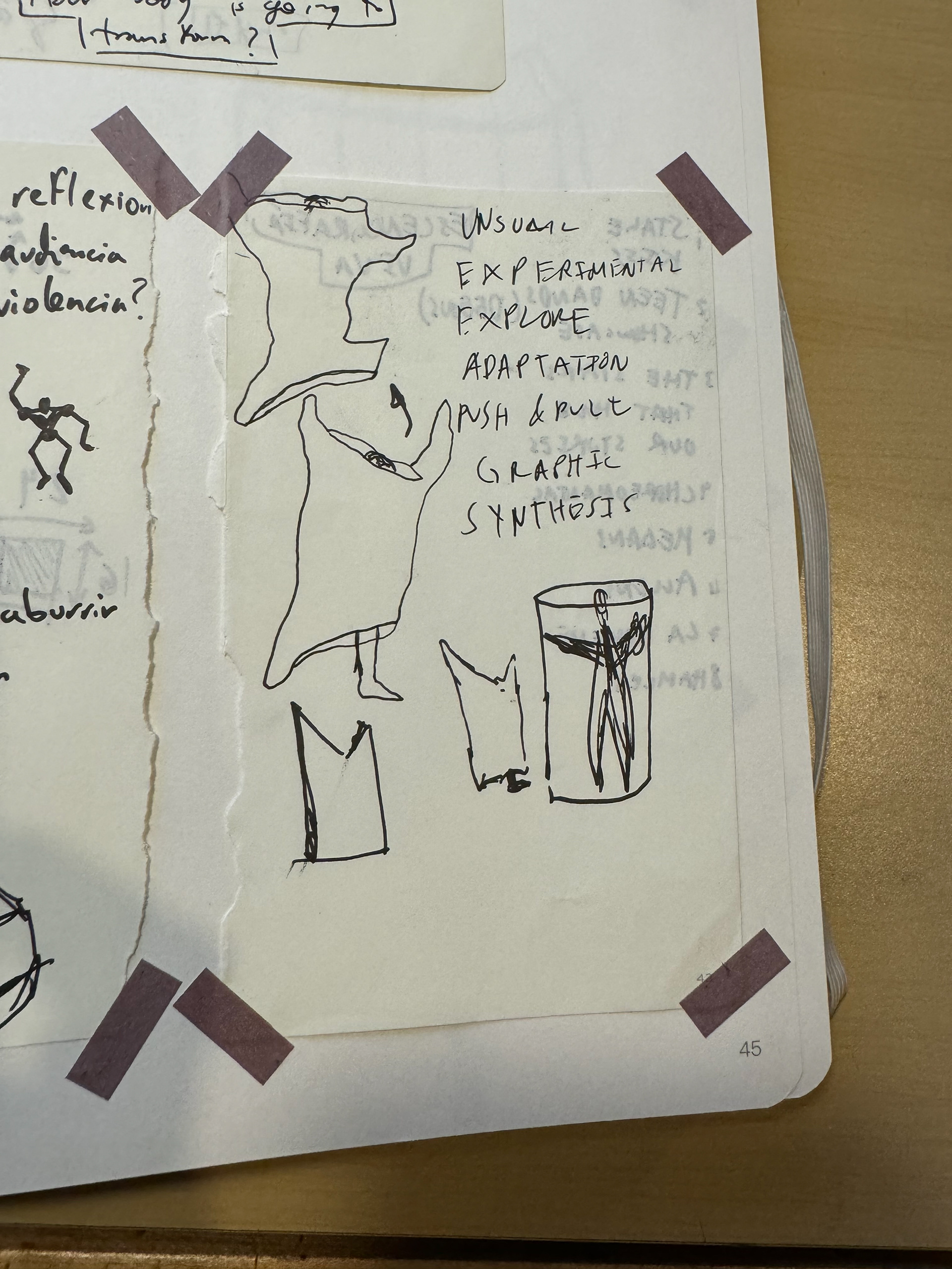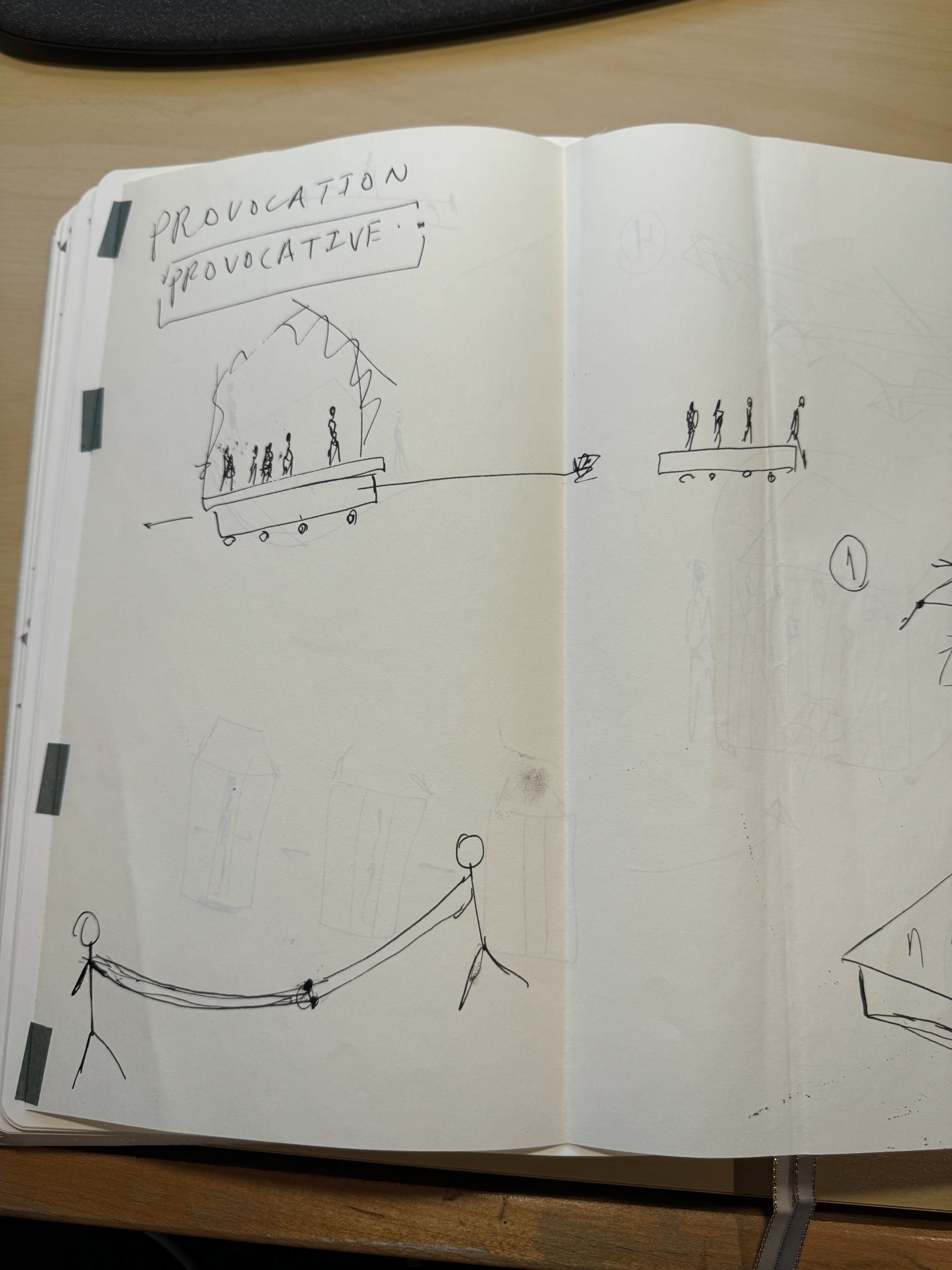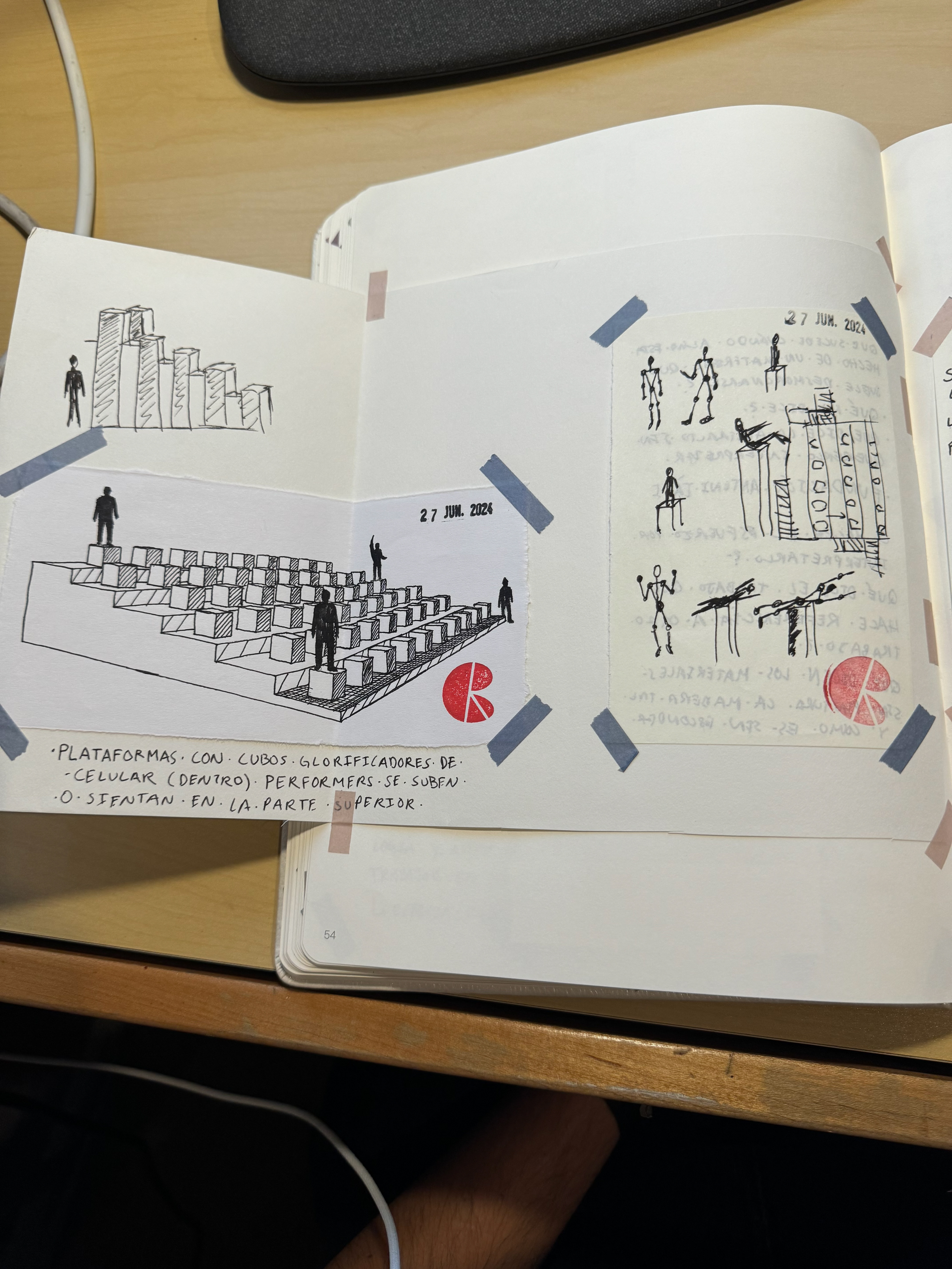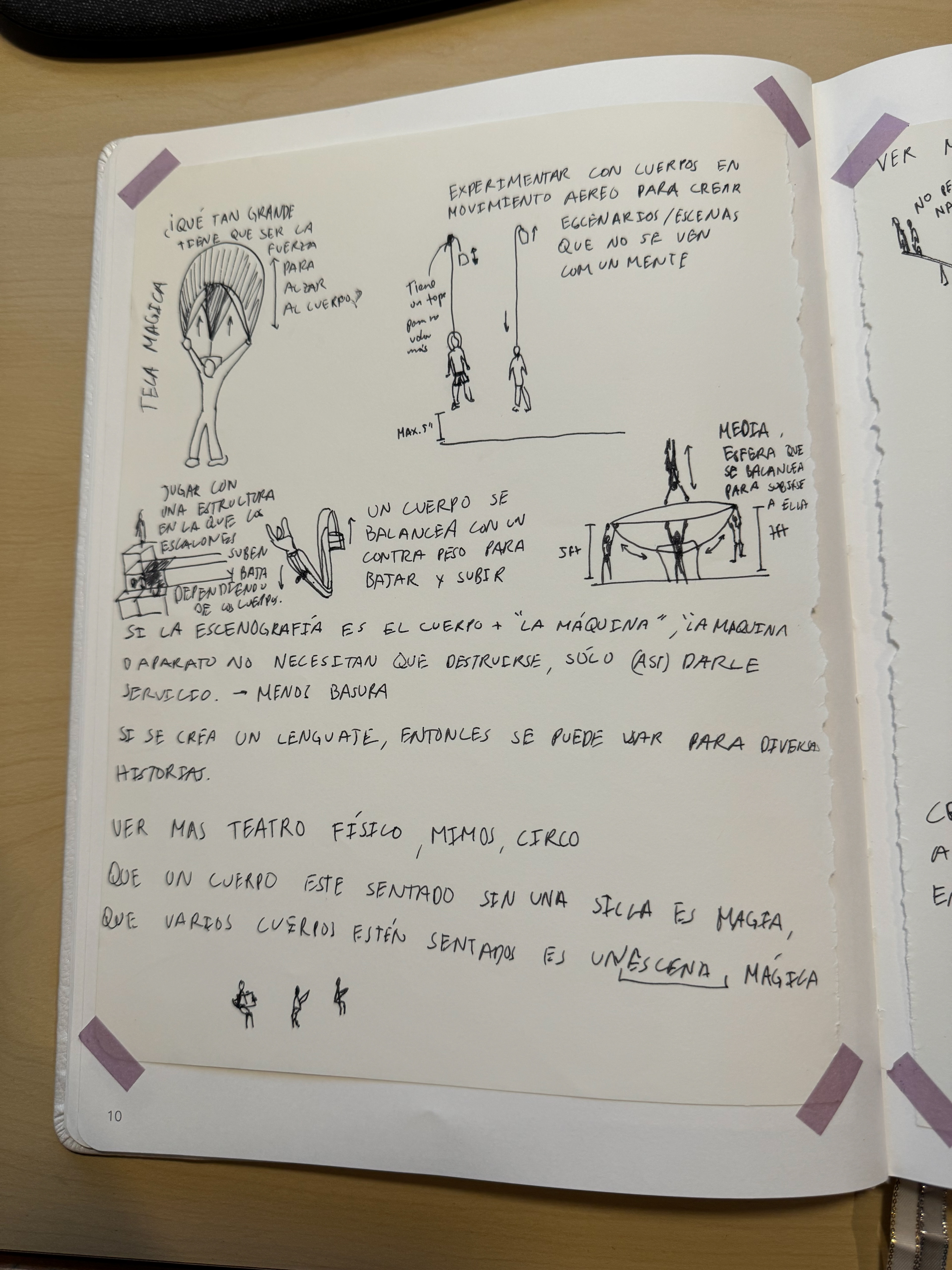 My initial sketches explored interactions between the body and mechanical structures. But the question kept emerging: is the body the scenography, or is it the structure the body activates? This tension became central to our exploration.