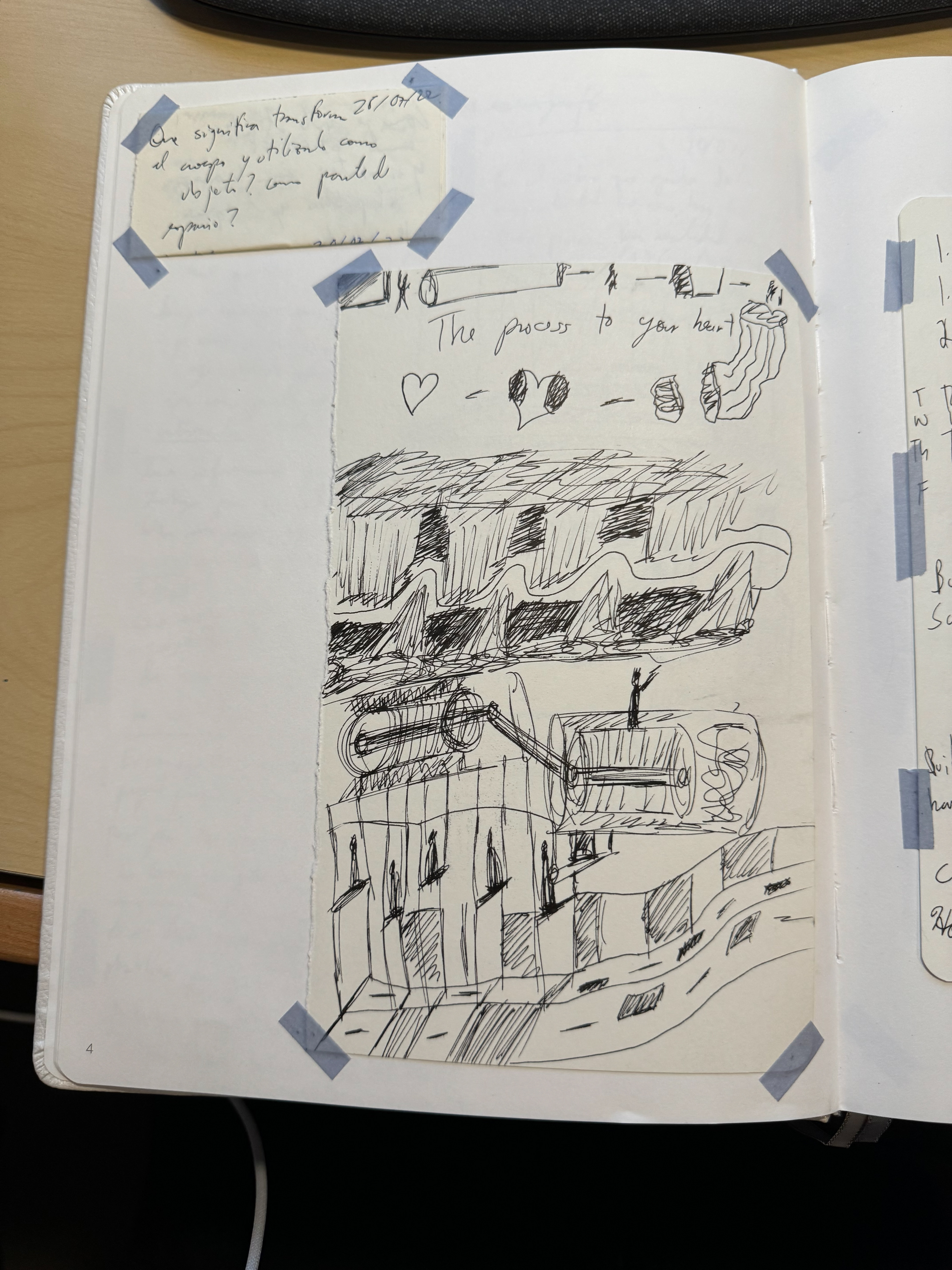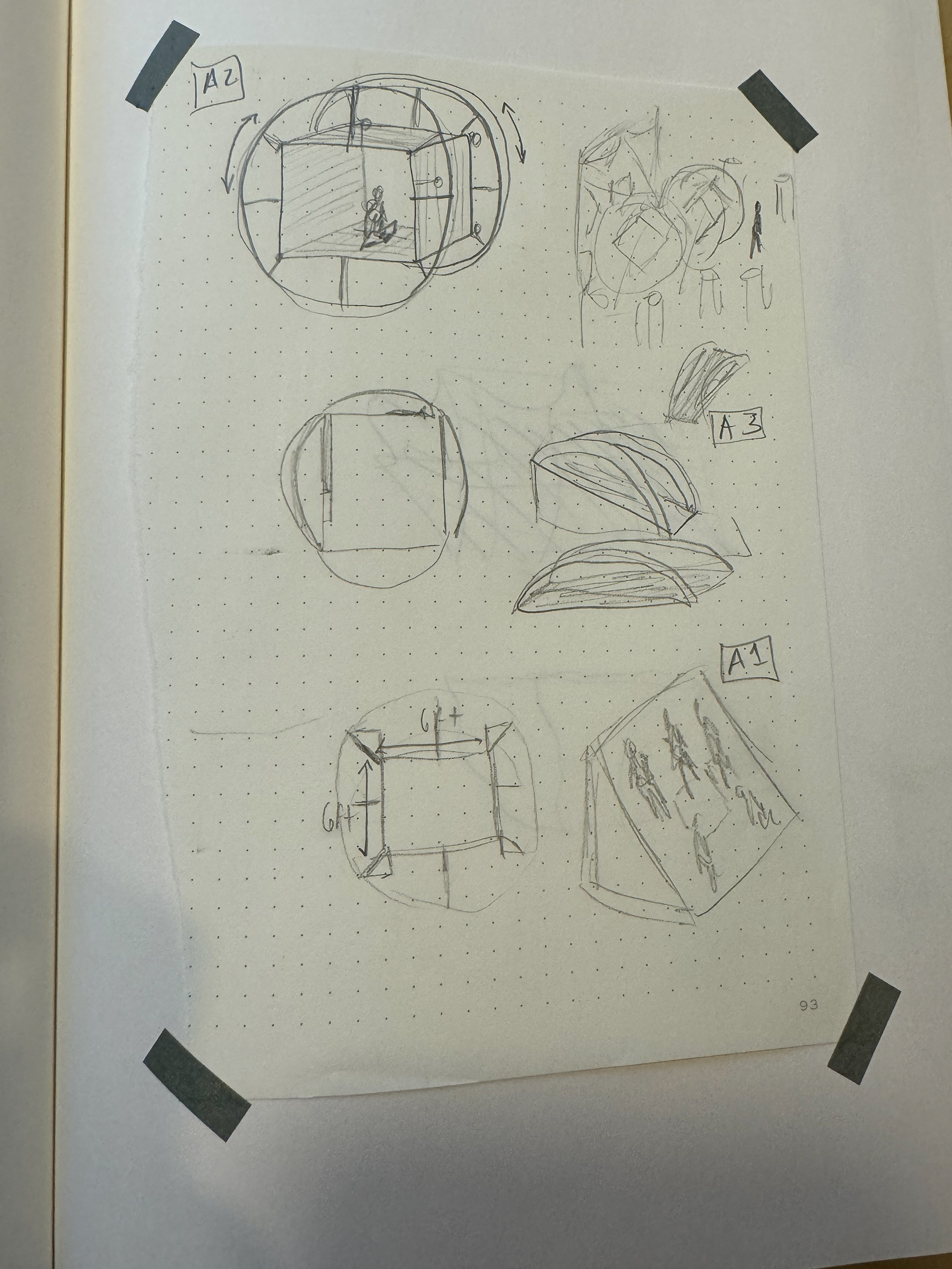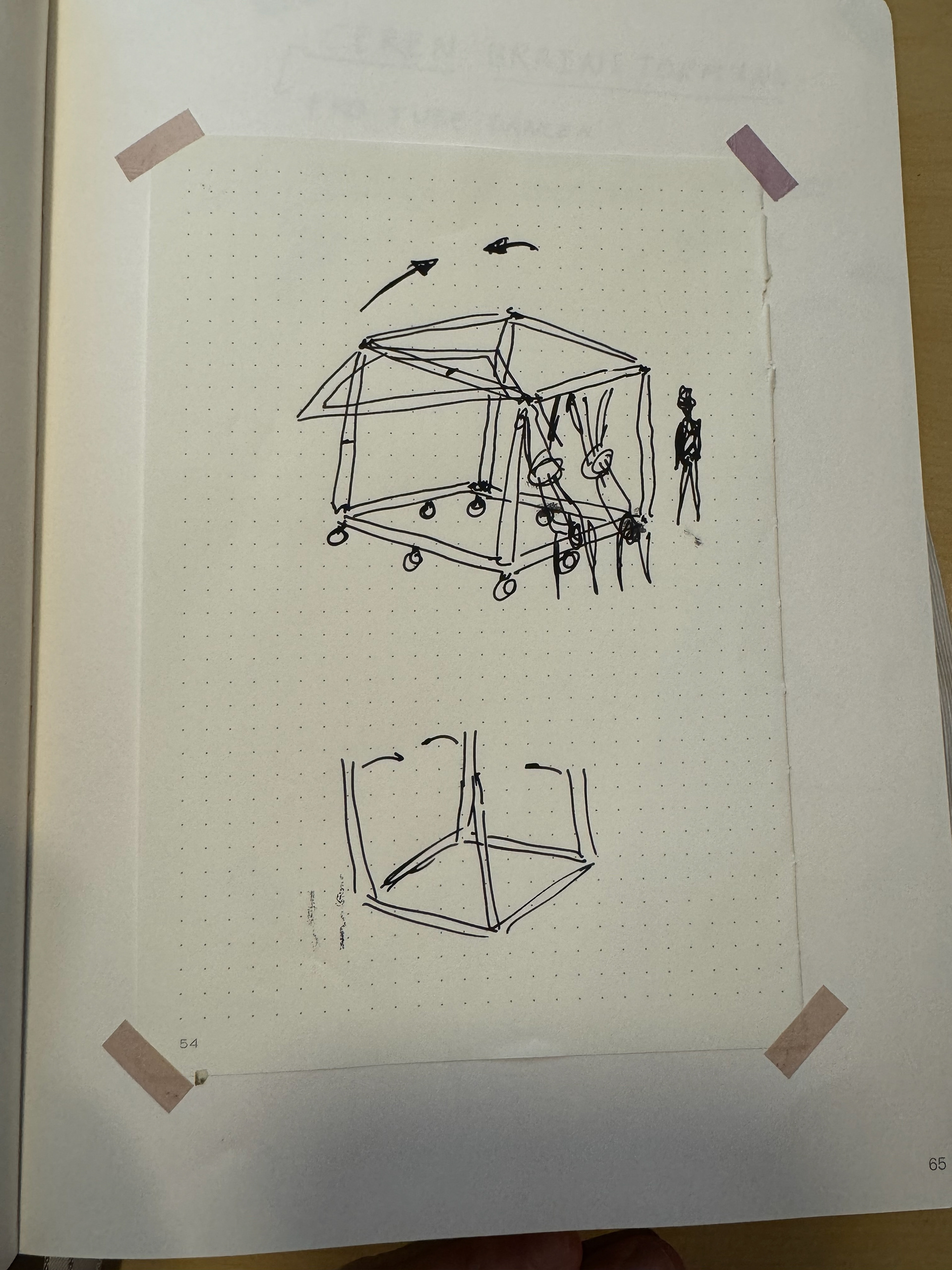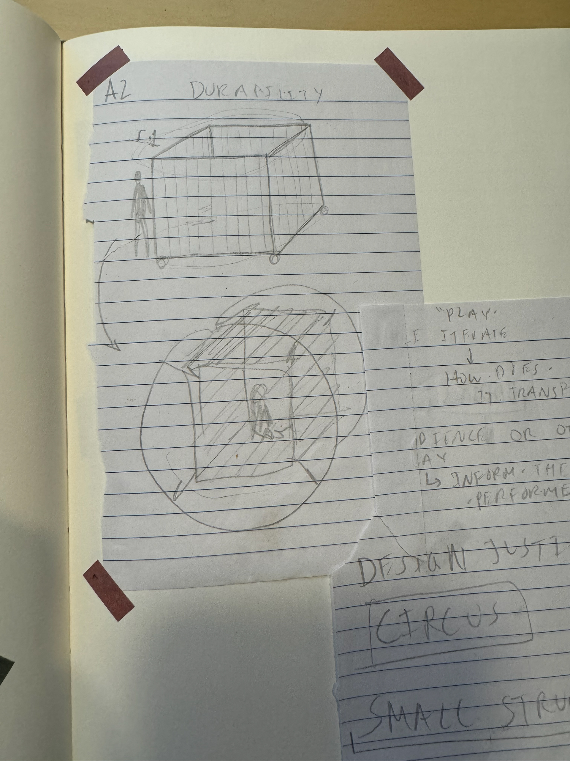 My initial sketches explored interactions between the body and mechanical structures. But the question kept emerging: is the body the scenography, or is it the structure the body activates? This tension became central to our exploration.