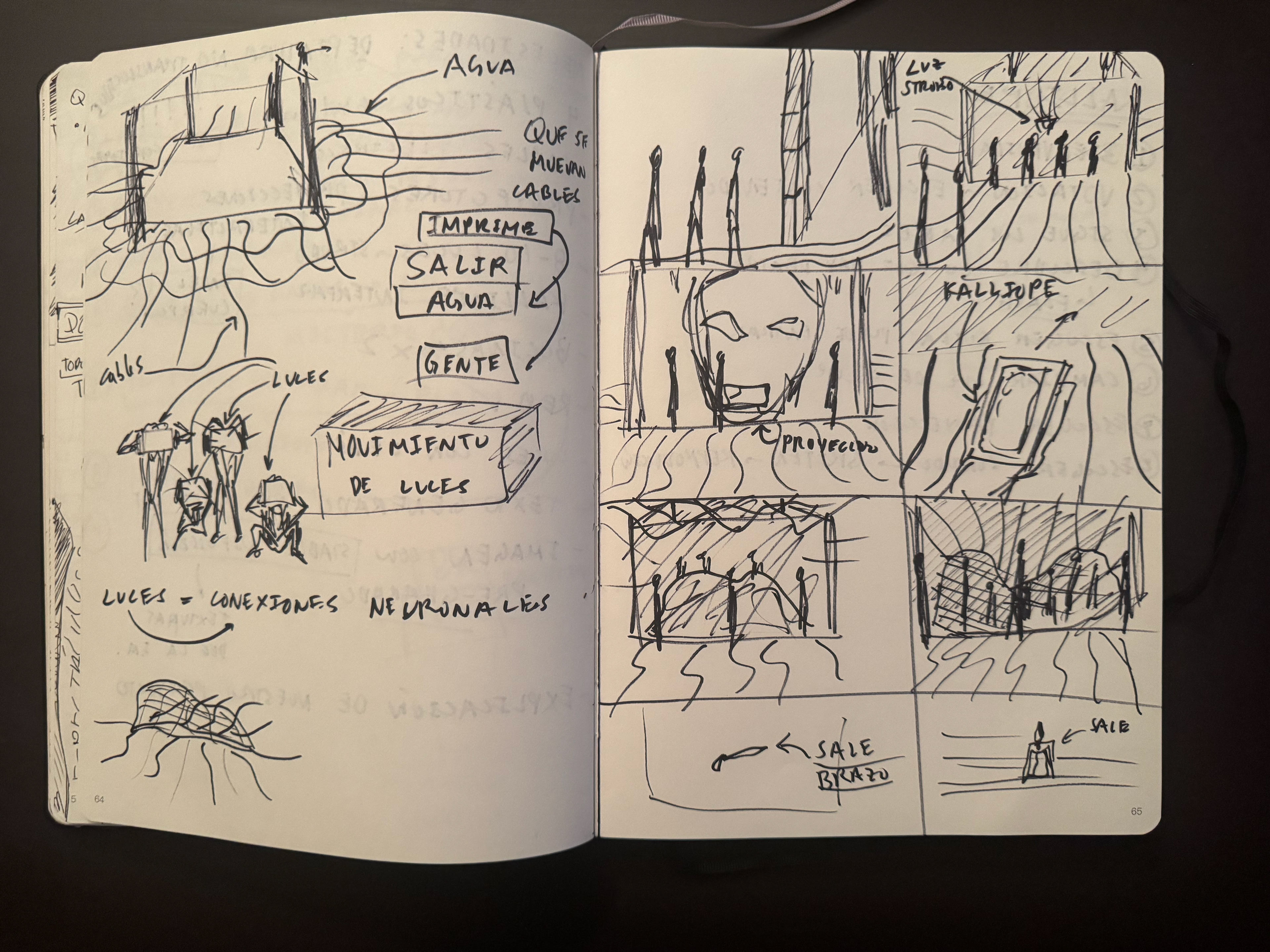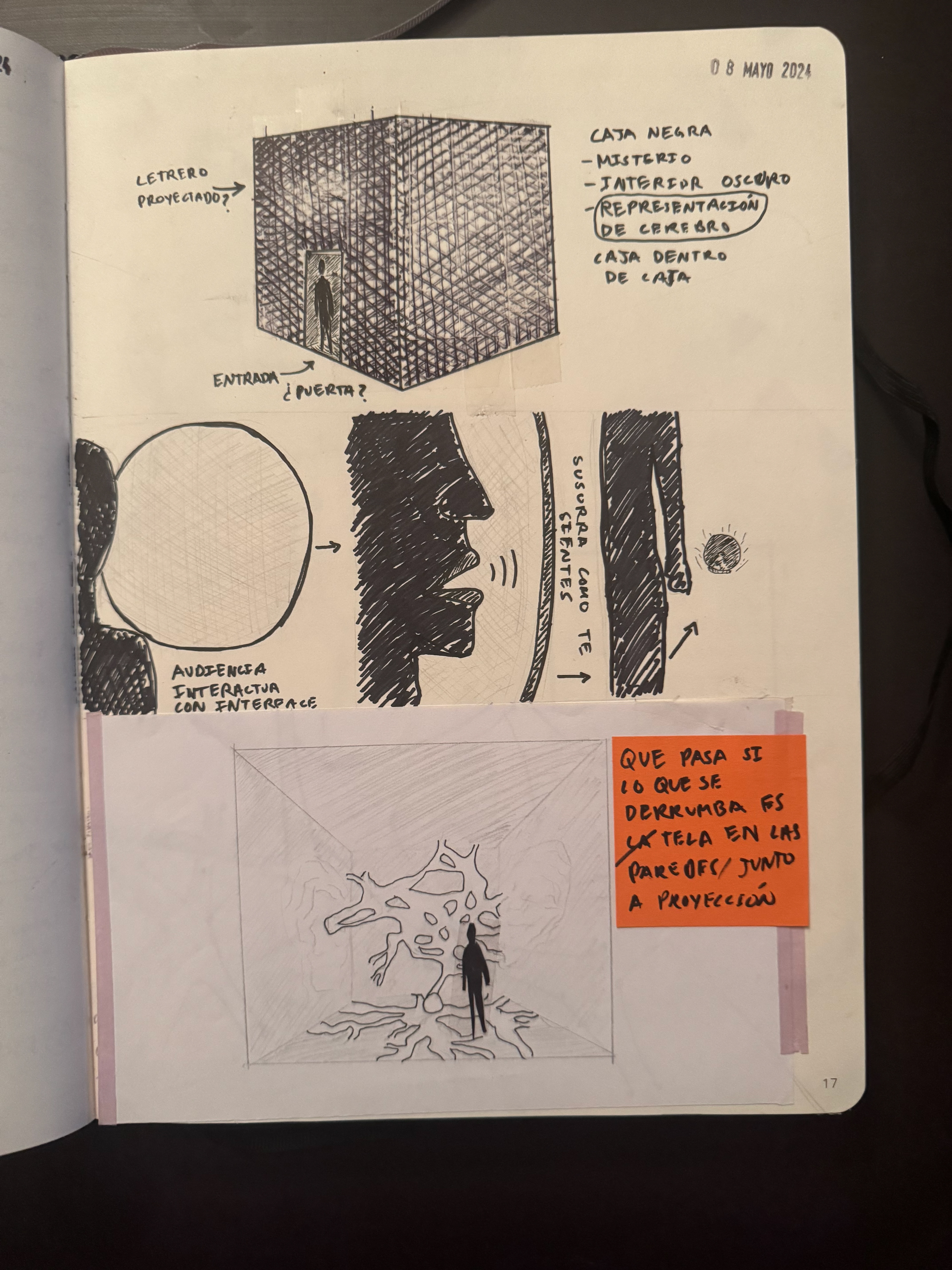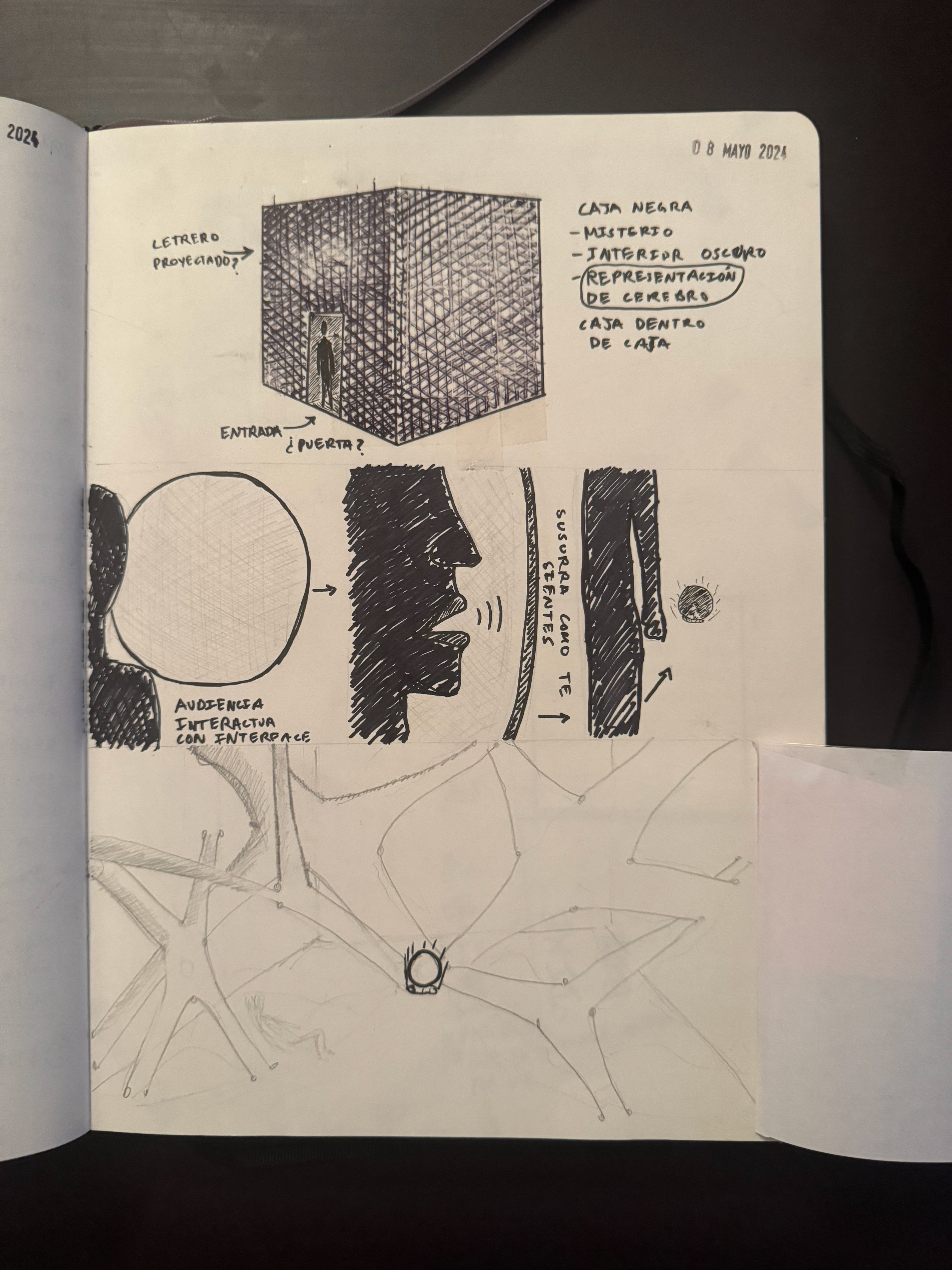 I started imagining spaces where the audience could be neurons or where the brain itself—like a black box—could be visualized. Most of my sketches were inspired by the stories and metaphors shared by the technologists and neural experts during our early sessions.