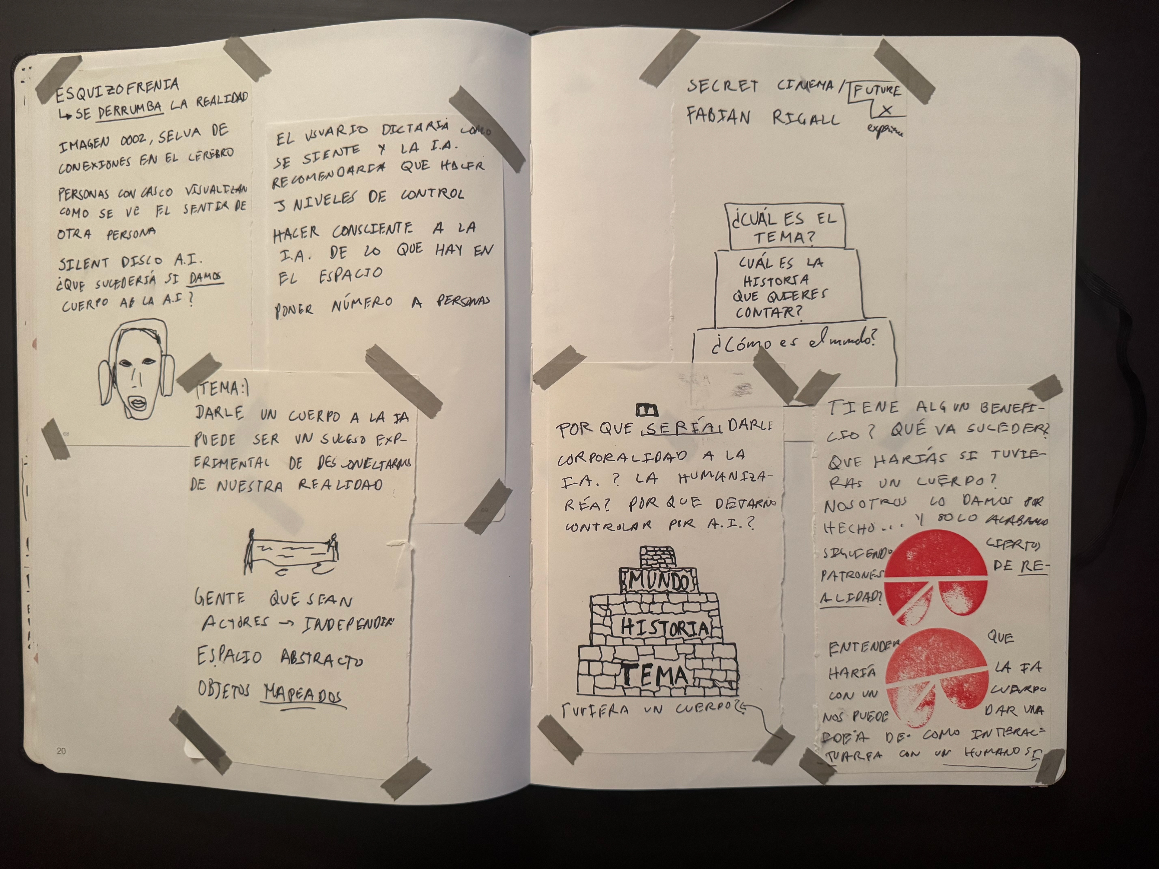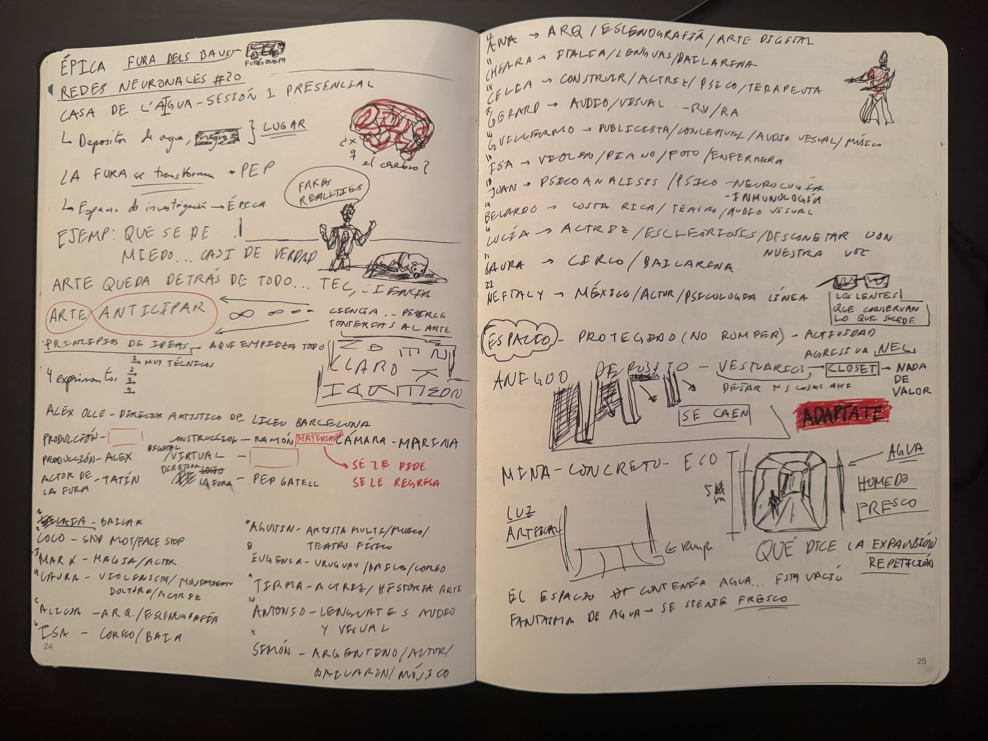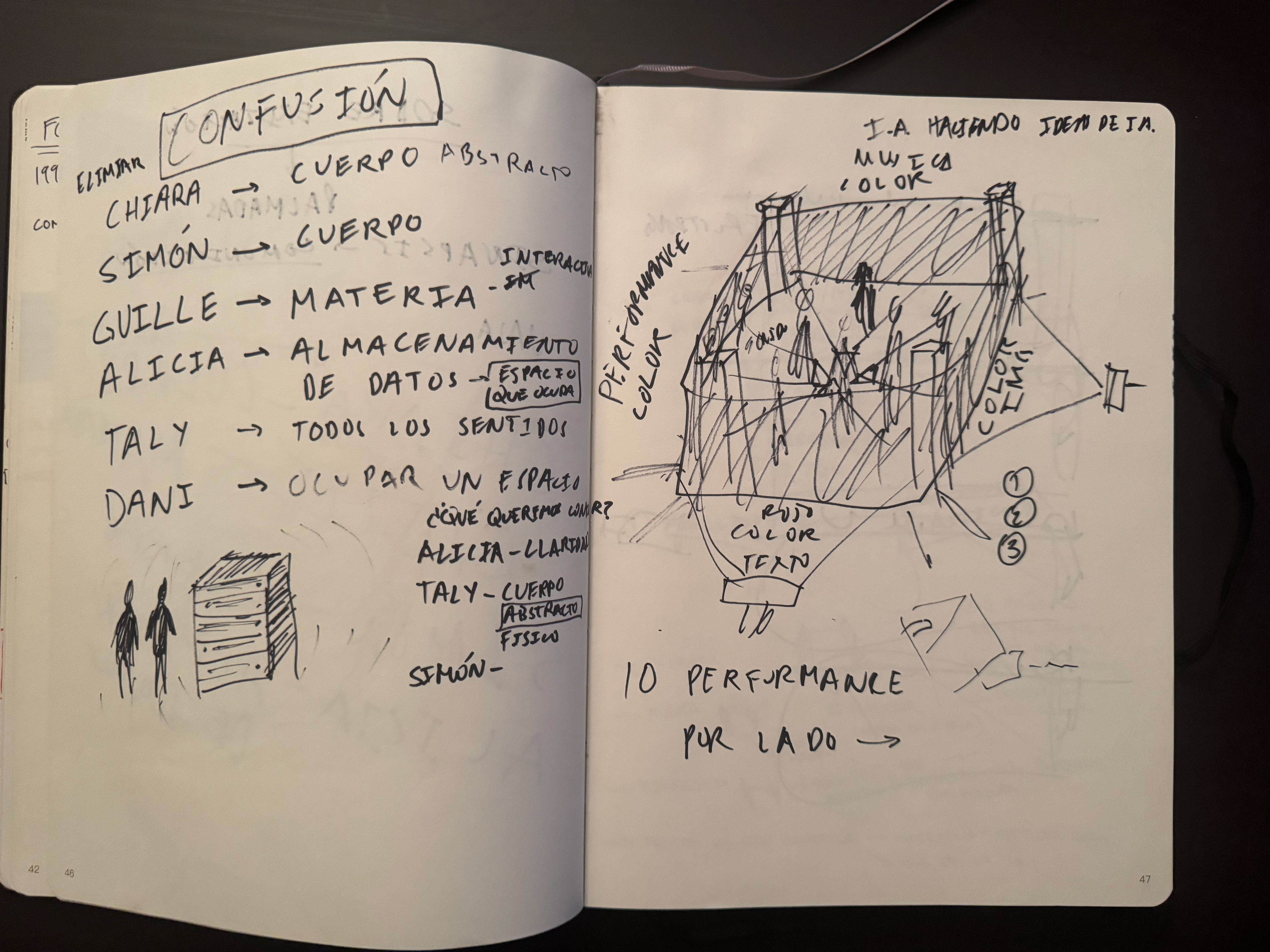 The process began with a week and a half of knowledge transfer through virtual talks with technologists and neural network experts. Then, in Barcelona, we collaborated in creative groups—exploring themes like the physicality of AI, hallucinations, schizophrenia, and the duality of good and bad AI—shaping it all into an immersive performance.