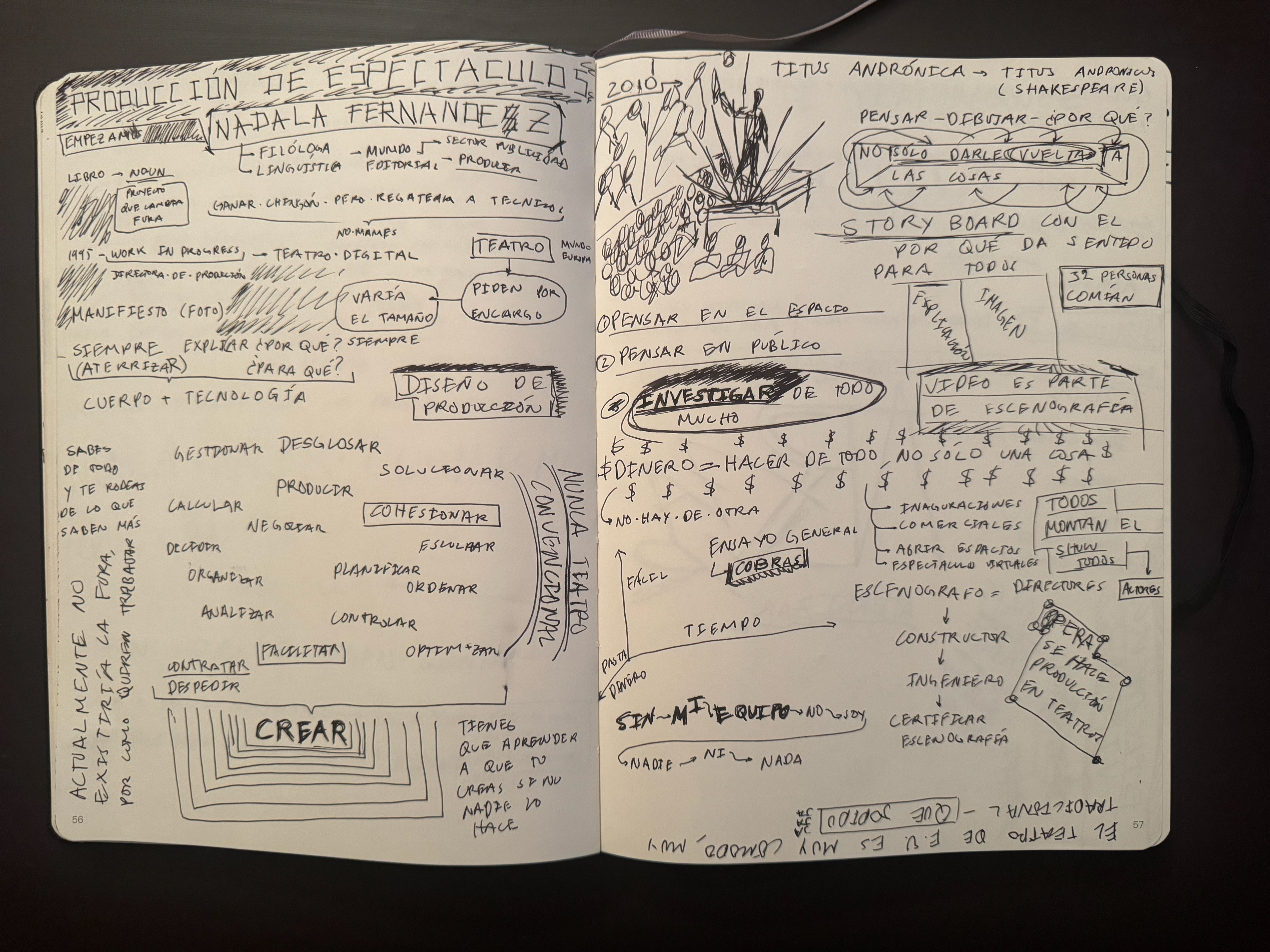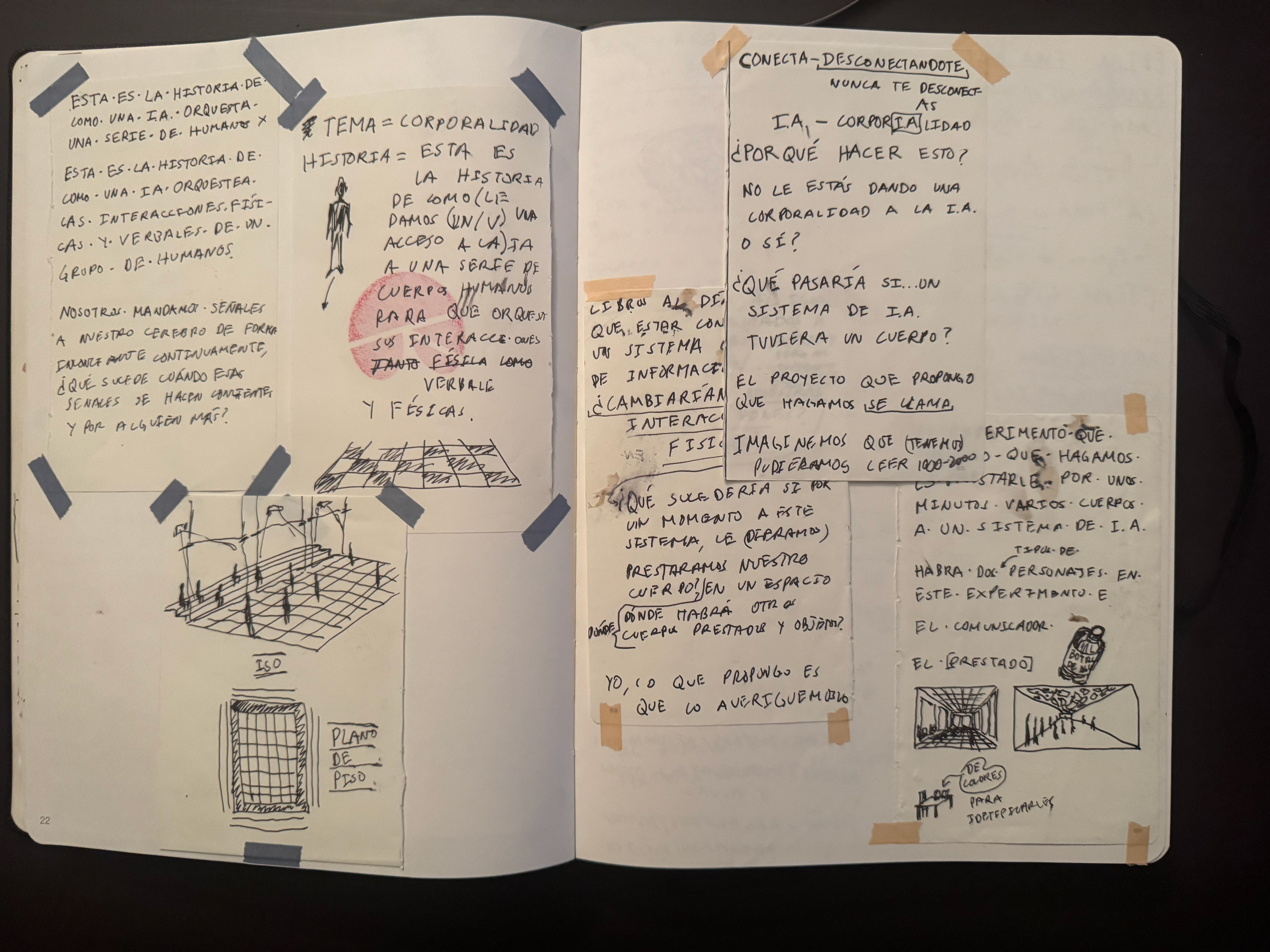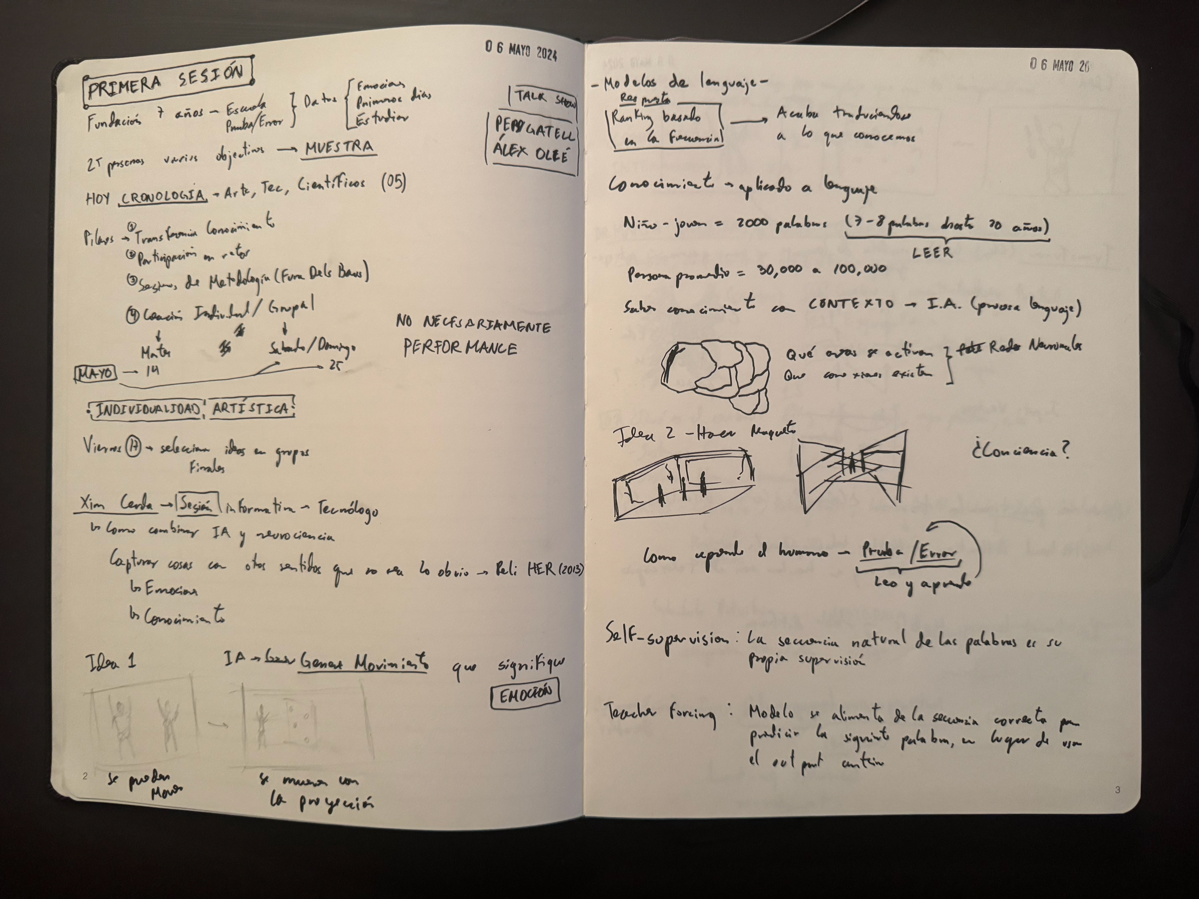 The process began with a week and a half of knowledge transfer through virtual talks with technologists and neural network experts. Then, in Barcelona, we collaborated in creative groups—exploring themes like the physicality of AI, hallucinations, schizophrenia, and the duality of good and bad AI—shaping it all into an immersive performance.
